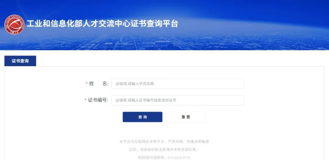 工信部人才交流中心证书查询网址:https://www.miitec.org.cn/