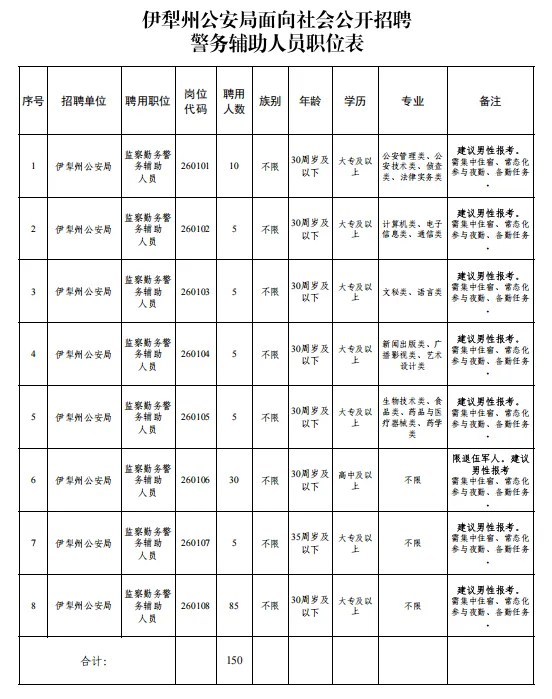 根据《中华人民共和国监察法》《新疆维吾尔自治区公安机关警务辅助人员招聘办法》等相关规定,新疆伊犁州公安局现面向社会公开招聘150名警务辅助人员,主要负责监察勤务工作。现就有关事项公告如下:
