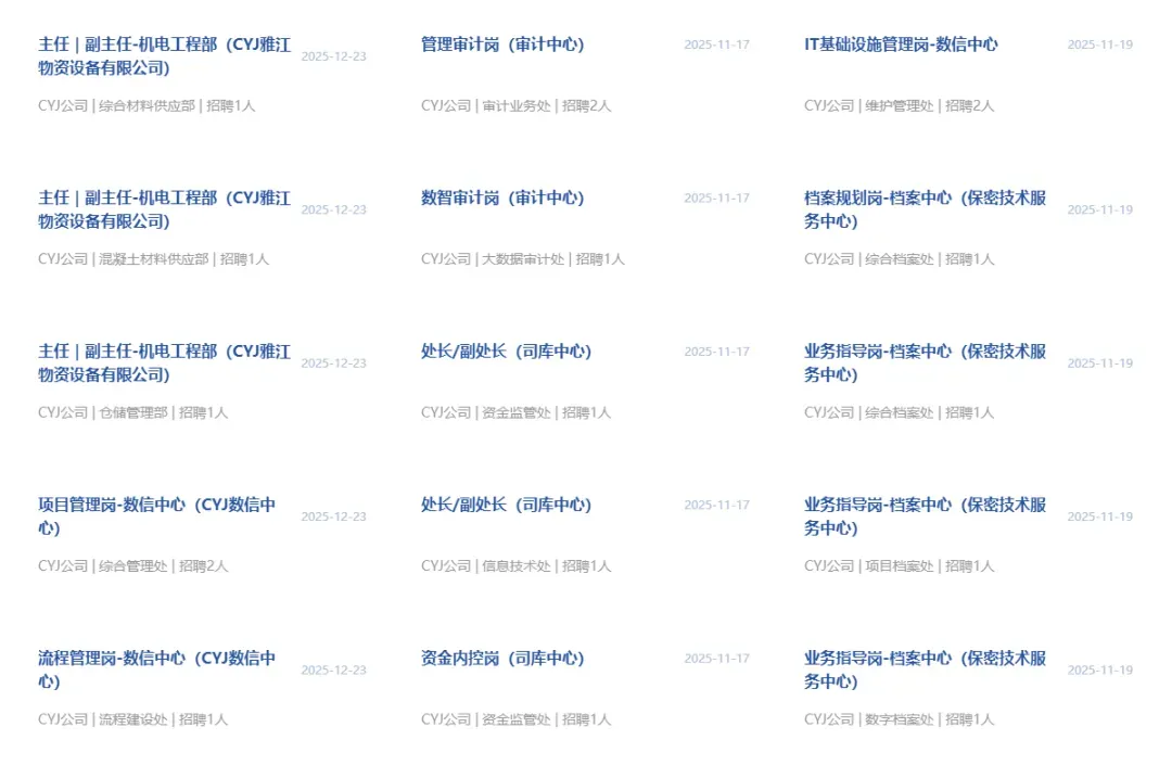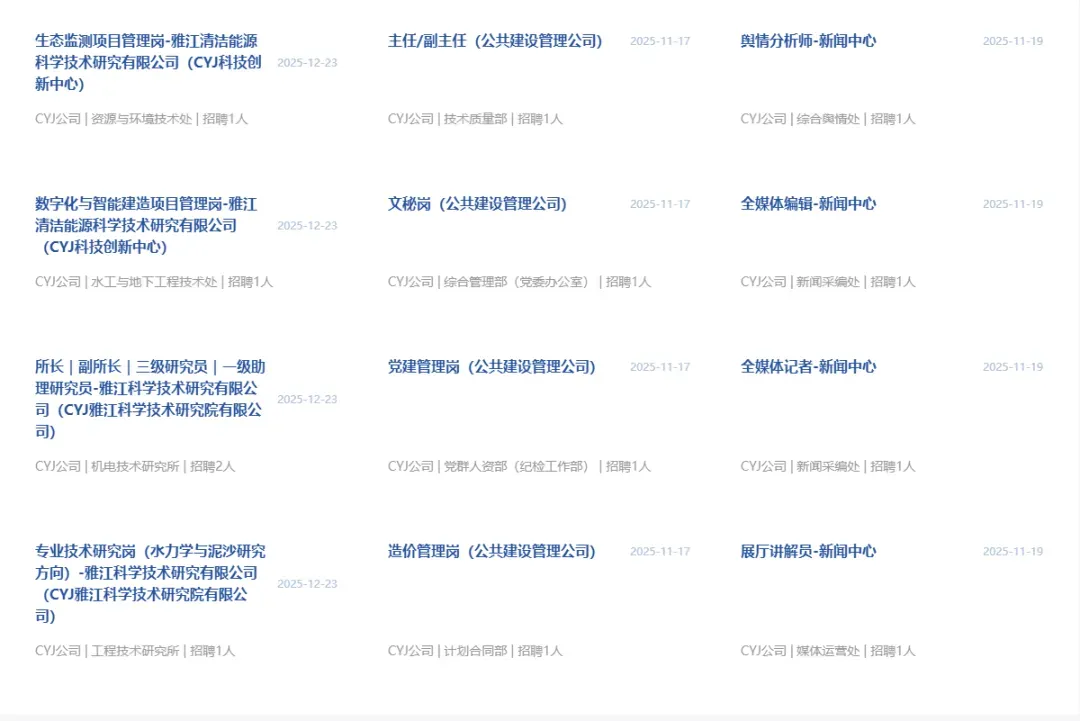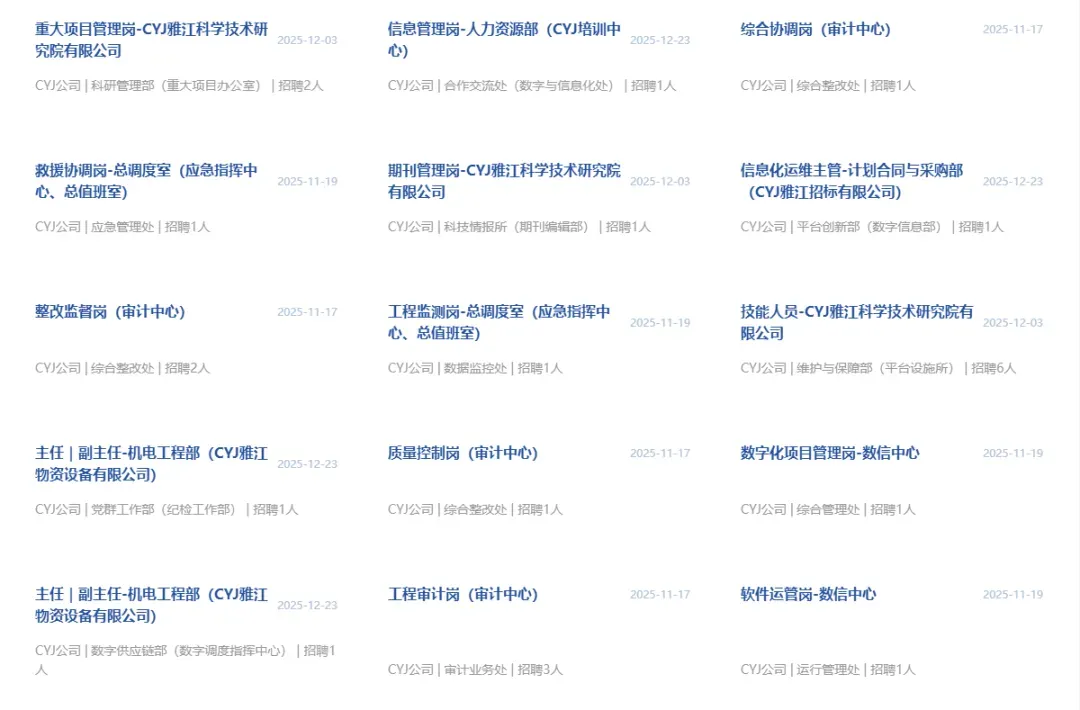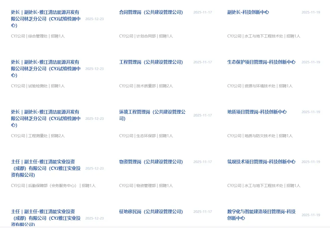在时代浪潮奔涌向前的当下,能源领域正经历着深刻变革与蓬勃发展。中国雅江集团,作为能源行业的新生力量,自2025年7月19日组建以来,便肩负着推动能源转型、保障能源安全的重要使命,秉持创新、协调、绿色、开放、共享的发展理念,积极投身于能源项目的开发、建设与运营,在水电、风电、光伏等多个领域持续发力。大家可能不知道,这可是货真价实的央企中的顶流,直接由国资委负责。别看它是第99家央企,排名可一点不含糊,在央企名录里排第22位。雅江集团业务主要倾向于能源领域,涵盖光伏、水电、风电等清洁能源。为拓宽选人用人渠道,近日雅江集团发布《中国雅江集团有限公司2026年招聘公告》。本次招聘涉及174个岗位,计划招聘249人,涵盖建设管理、水利水电工程师、地质勘探专家、施工管理人员、机电工程管理、公共建设管理等多个岗位。集团公司部分二级单位面向社会公开招聘社会成熟人才。现将有关事项公告如下:档案管理岗、工程管理岗、机电管理岗、金结管理岗、物资管理岗、项目管理岗、人力管理岗、财务管理岗、造价管理岗、安全运维管理岗、电气管理岗、控制管理岗、生态环保管理岗、房屋建筑管理岗、交通工程岗、工程监测岗、数字化项目、档案规划、业务指导、IT基础设施管理岗等等。公告未明确薪资待遇,但作为央企的雅江集团待遇不会差,相关信息推测,绝大多数员工的薪资能拿到25~30W,还有带薪年假、项目补贴、丰厚的年终奖,你能想到的,央企都能给你包揽到!七险二金按最高比例缴纳,有补充医疗保险、企业年金、人才公寓、购房补贴等。养老保险、工伤保险、生育保险、基本医疗保险失业保险、补充医疗保险、员工福利商业保险。- 工程技术类:基础年薪25-35万+高原补贴(8000元/月)+项目奖金。