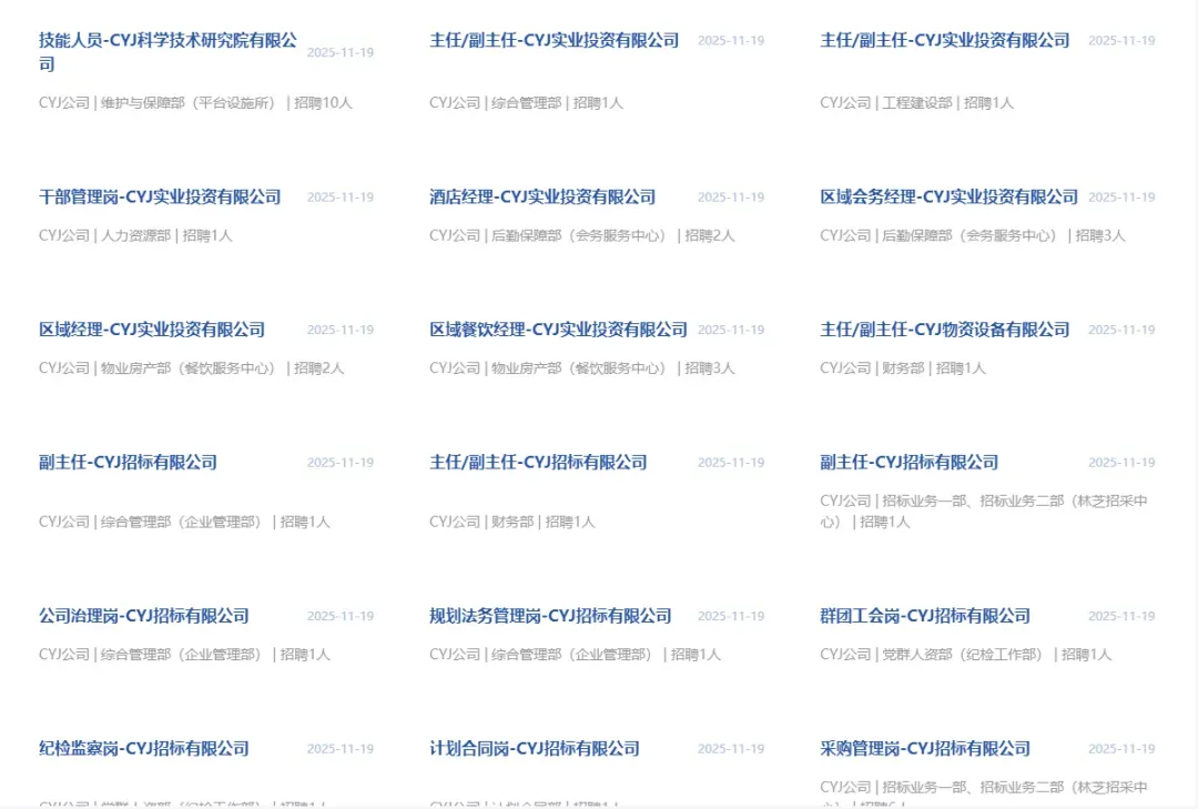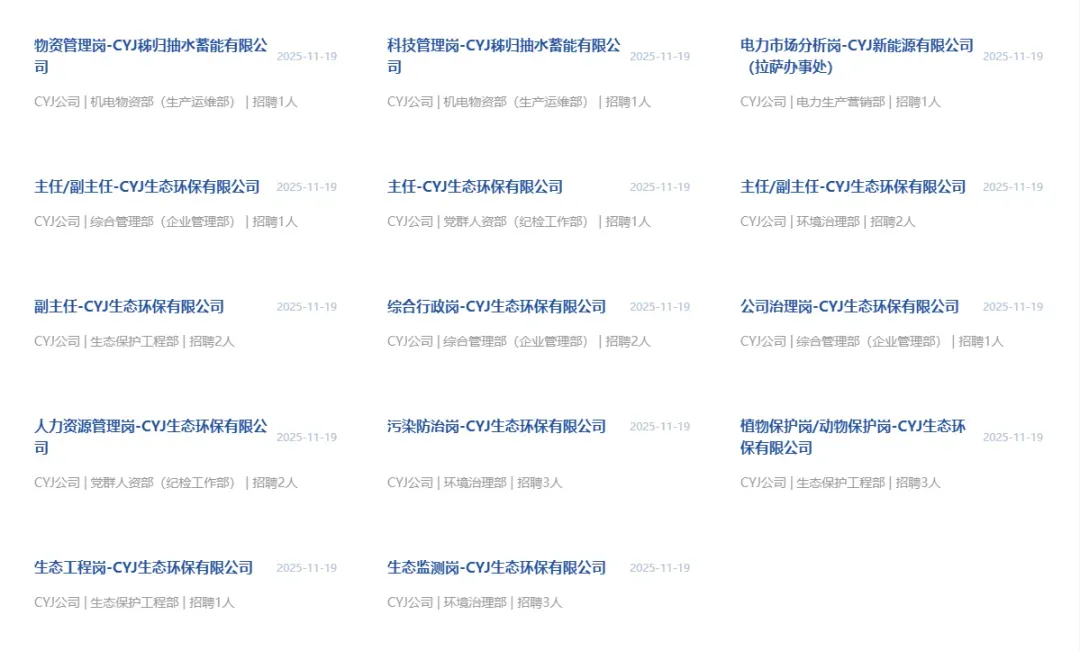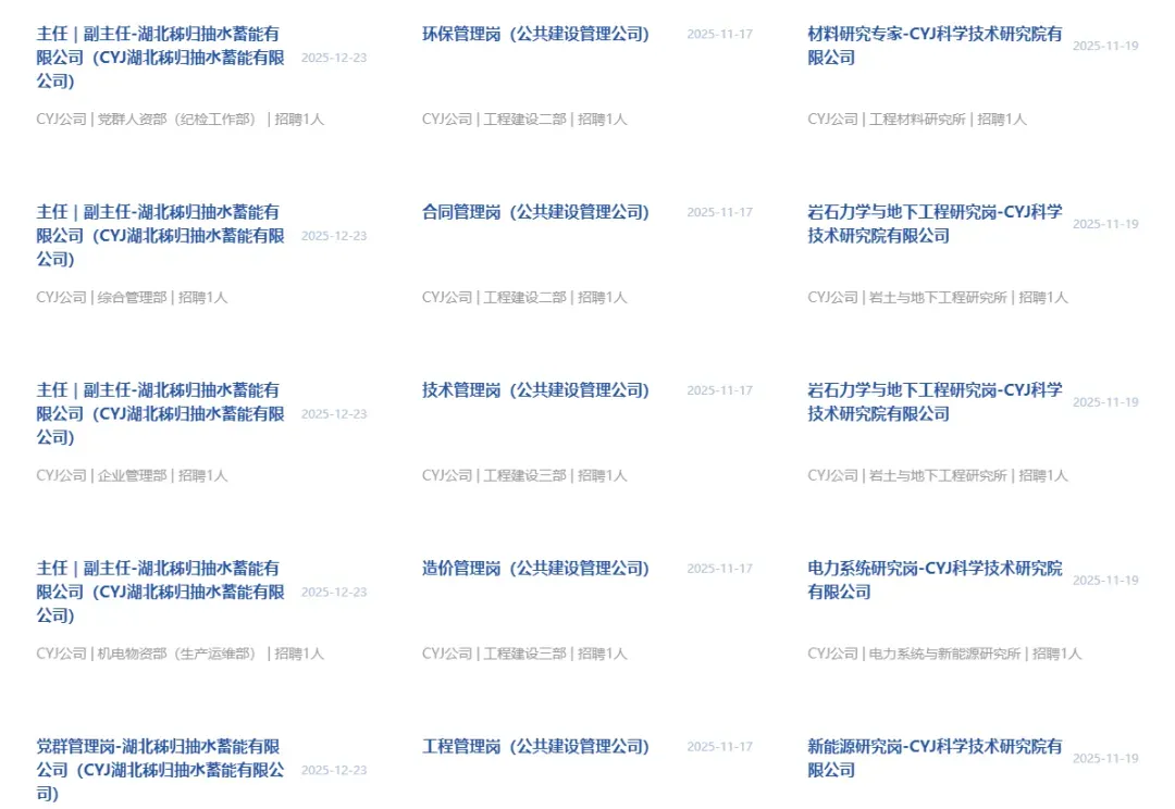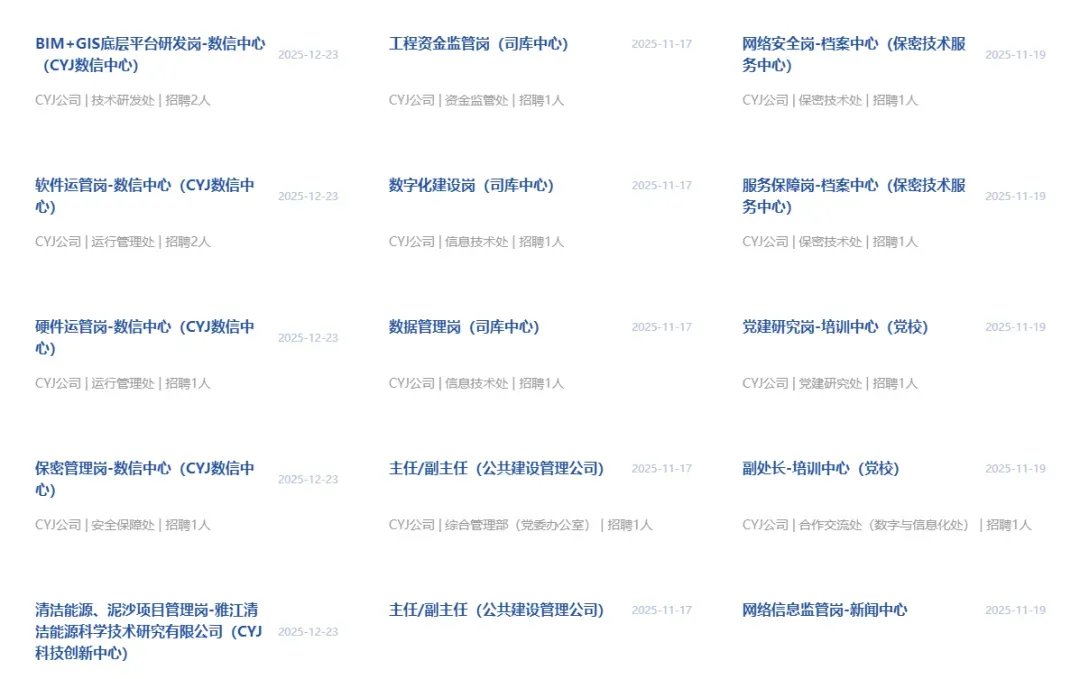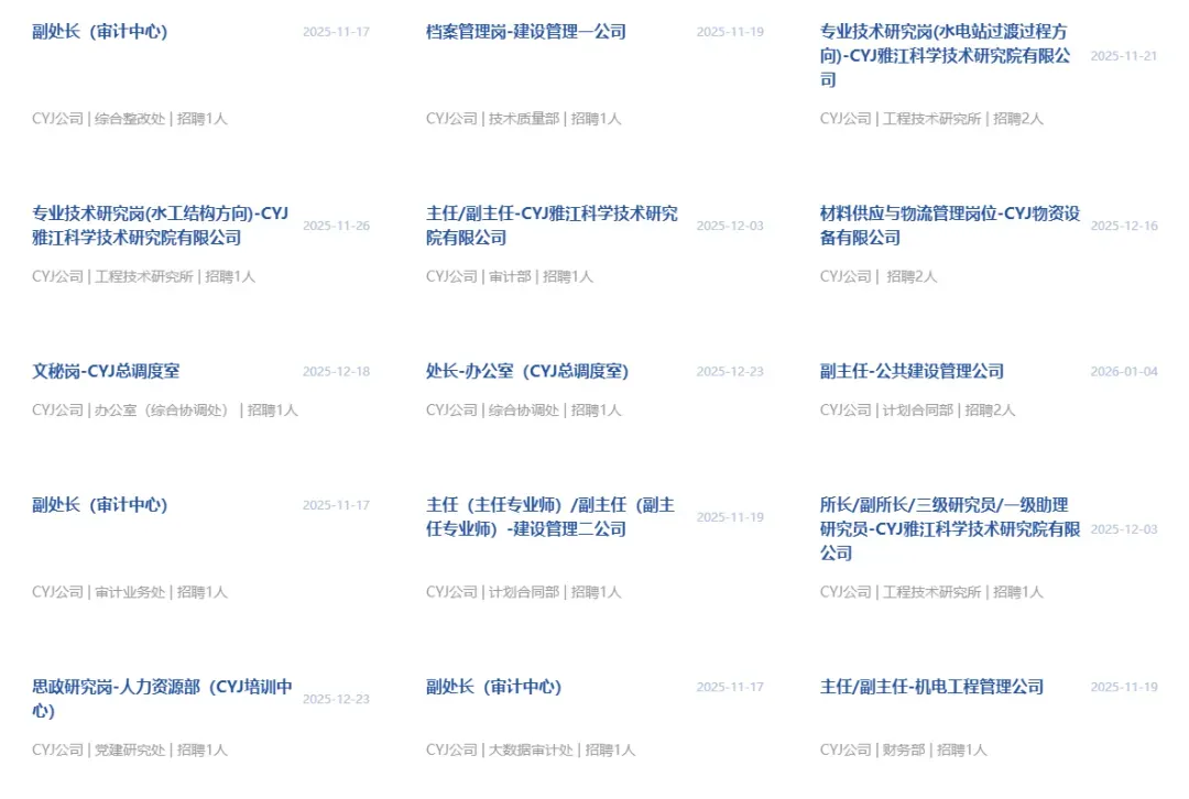 在时代浪潮奔涌向前的当下,能源领域正经历着深刻变革与蓬勃发展。中国雅江集团,作为能源行业的新生力量,自2025年7月19日组建以来,便肩负着推动能源转型、保障能源安全的重要使命,秉持创新、协调、绿色、开放、共享的发展理念,积极投身于能源项目的开发、建设与运营,在水电、风电、光伏等多个领域持续发力。大家可能不知道,这可是货真价实的央企中的顶流,直接由国资委负责。别看它是第99家央企,排名可一点不含糊,在央企名录里排第22位。雅江集团业务主要倾向于能源领域,涵盖光伏、水电、风电等清洁能源。为拓宽选人用人渠道,近日雅江集团发布《中国雅江集团有限公司2026年招聘公告》。本次招聘涉及174个岗位,计划招聘249人,涵盖建设管理、水利水电工程师、地质勘探专家、施工管理人员、机电工程管理、公共建设管理等多个岗位。集团公司部分二级单位面向社会公开招聘社会成熟人才。现将有关事项公告如下:档案管理岗、工程管理岗、机电管理岗、金结管理岗、物资管理岗、项目管理岗、人力管理岗、财务管理岗、造价管理岗、安全运维管理岗、电气管理岗、控制管理岗、生态环保管理岗、房屋建筑管理岗、交通工程岗、工程监测岗、数字化项目、档案规划、业务指导、IT基础设施管理岗等等。公告未明确薪资待遇,但作为央企的雅江集团待遇不会差,相关信息推测,绝大多数员工的薪资能拿到25~30W,还有带薪年假、项目补贴、丰厚的年终奖,你能想到的,央企都能给你包揽到!七险二金按最高比例缴纳,有补充医疗保险、企业年金、人才公寓、购房补贴等。养老保险、工伤保险、生育保险、基本医疗保险失业保险、补充医疗保险、员工福利商业保险。- 工程技术类:基础年薪25-35万+高原补贴(8000元/月)+项目奖金。