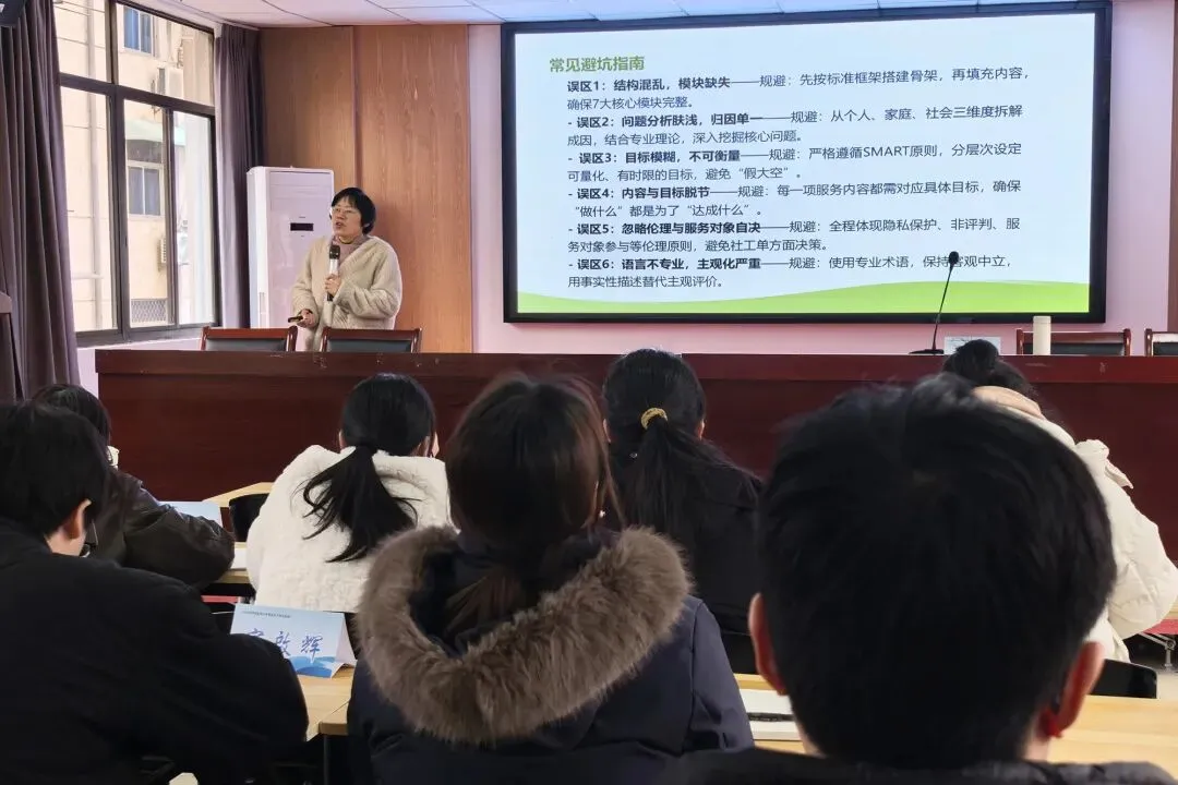 王老师从计划书的本质谈起,强调它不仅是一份任务清单,更是陪伴服务对象成长的"导航图"。她结合具体案例,讲解了如何把SMART原则、生态系统理论等专业工具融入计划书中,将抽象的服务目标化为可操作、可评估的具体步骤。