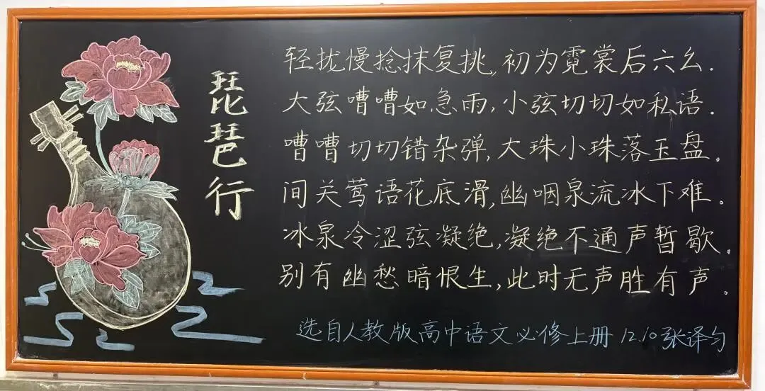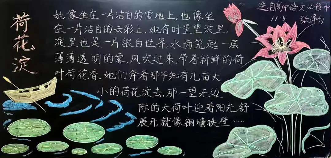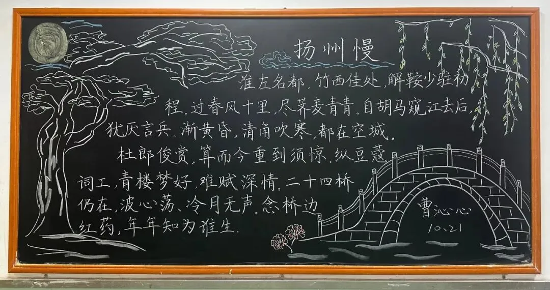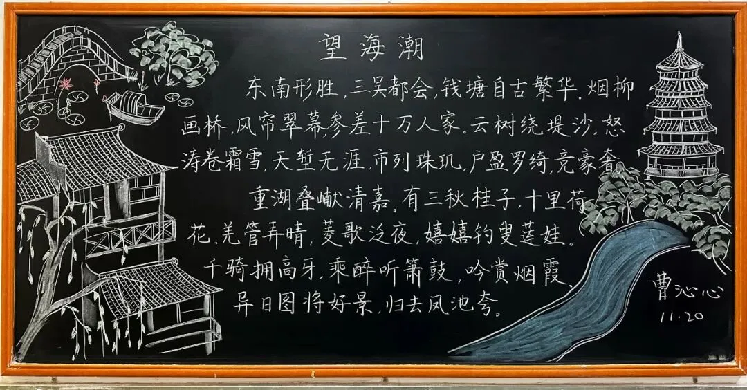 师从张华军副教授,主要研究领域为中学语文教学。板书是语文课堂的第二张面孔,一笔一画的书写不仅是形神之美的传递,更是情感意蕴的凝练。本学期我设计了《扬州慢》《望海潮》《桂枝香·金陵怀古》三组板报,淮左名都的黍离之悲、烟柳钱塘的繁华气象、金陵古都的澄江似练,在撰写绘制的过程中着力将三座古城的历史脉络融入方寸之间。这份荣誉的获得离不开老师们的肯定和厚爱,更得益于中心老师们在板书设计与书写训练上的悉心指导。未来我会将这份鼓励化为动力,继续打磨板书技艺,在笔墨流转间传递语文教育的温暖与深度。