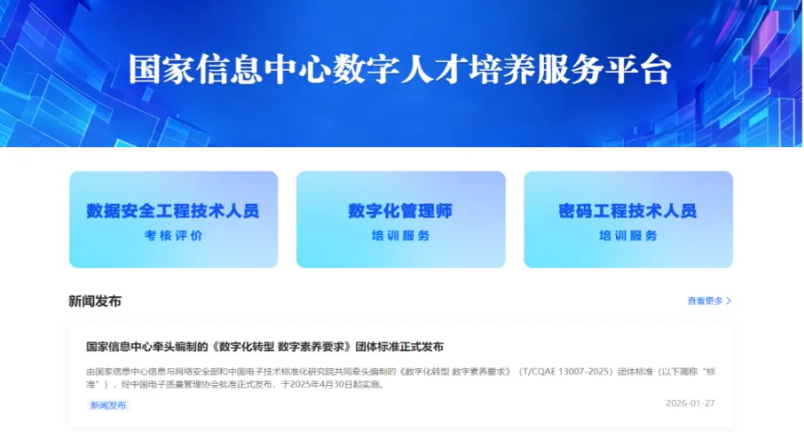 人力资源社会保障部于2024年发布《关于公布数字技术工程师培育项目第三批评价机构目录的通知》,国家信息中心获评“数据安全工程技术人员”评价机构,负责全国数据安全(初、中、高级)工程师的考核评价工作;同时也是“数字化管理师”及“密码工程技术人员”两项职业的培训机构。为更好落实相关工作,依据人力资源社会保障部《数字技术工程师培育项目培训机构和评价机构管理办法》要求,建成“数据安全工程技术人员评价服务平台”,该平台集线上考核及考务管理于一体,具备考核信息和学员信息归集、考核成绩报送及证书查询管理等功能,与人力资源社会保障部“工程服务平台专业技术等级证书管理系统”实现技术对接。