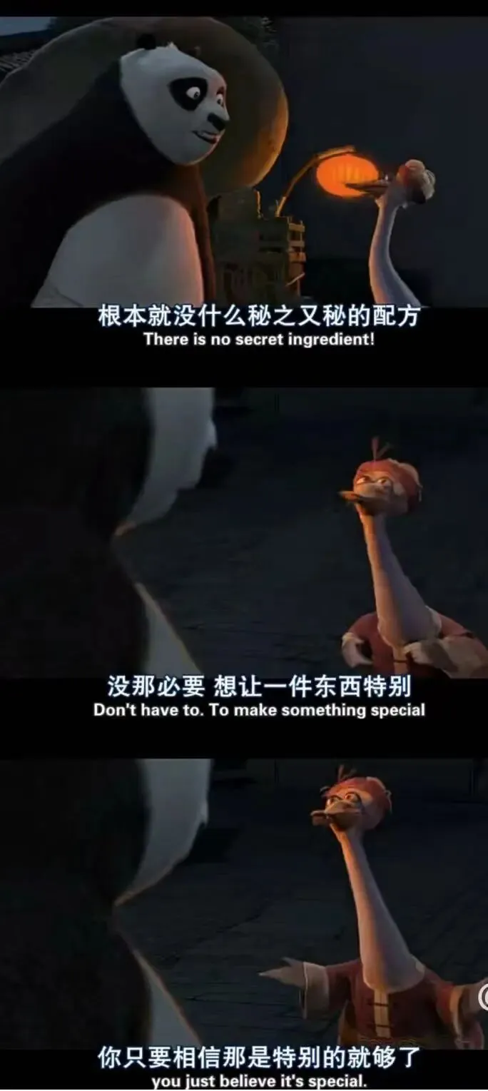 《功夫熊猫1》里,阿宝的面馆老板鹅爸爸说,“其实好吃的面没有(成文的)秘方,秘方就是你足够相信你做出的面就是最好吃的。”