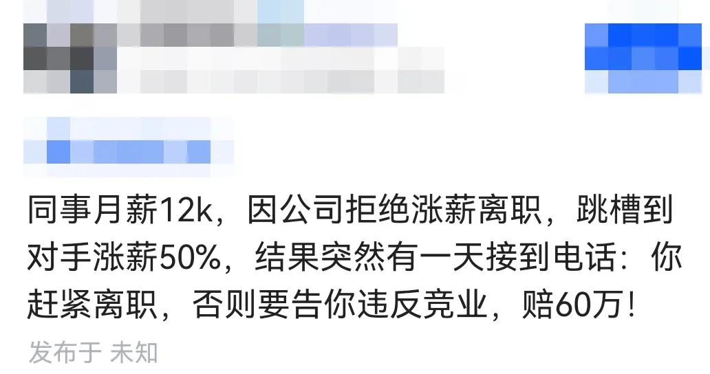 同事月薪12k,因公司拒绝涨薪离职,跳槽到对手涨薪50%,结果突然有一天接到电话:“你赶紧离职,否则要告你违反竞业,赔60万!”