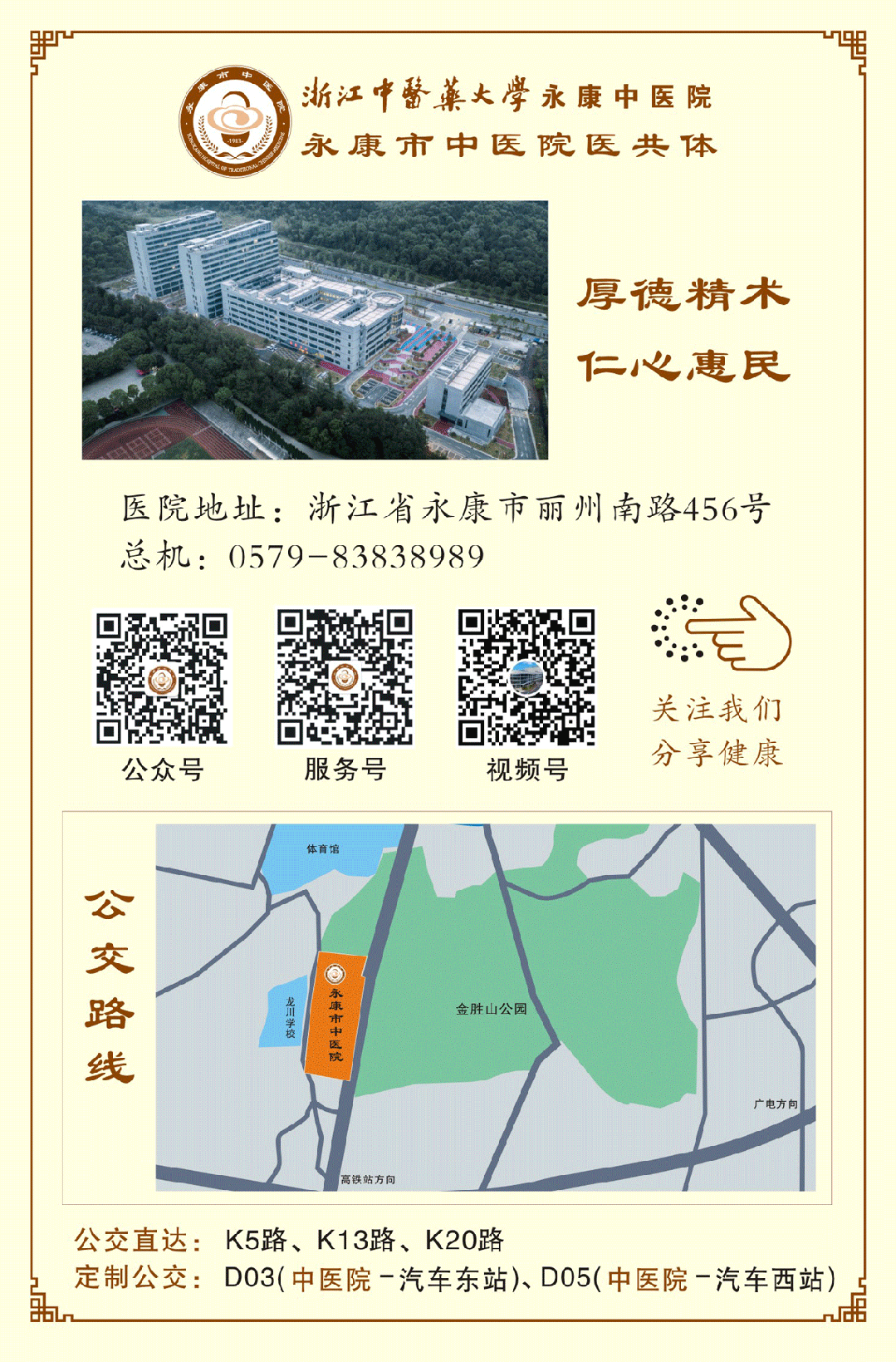 浙江省永康市中医院是一座集医疗、保健、康复、教学于一体的综合性非盈利性三级乙等公立中医医院,是全国基层中医药工作先进单位、全国中医药适宜技术推广基地、浙江省中医助理全科医师培训基地、浙江中医药大学、江西中医药大学、永康卫校的教学和实习基地,是浙江中医药大学永康中医院、浙江中医药大学金华研究院永康分院、浙江中医药大学金华研究院附属医院、浙江省中医院医疗联合体成员单位、浙江大学医学院附属第四医院协作医院。