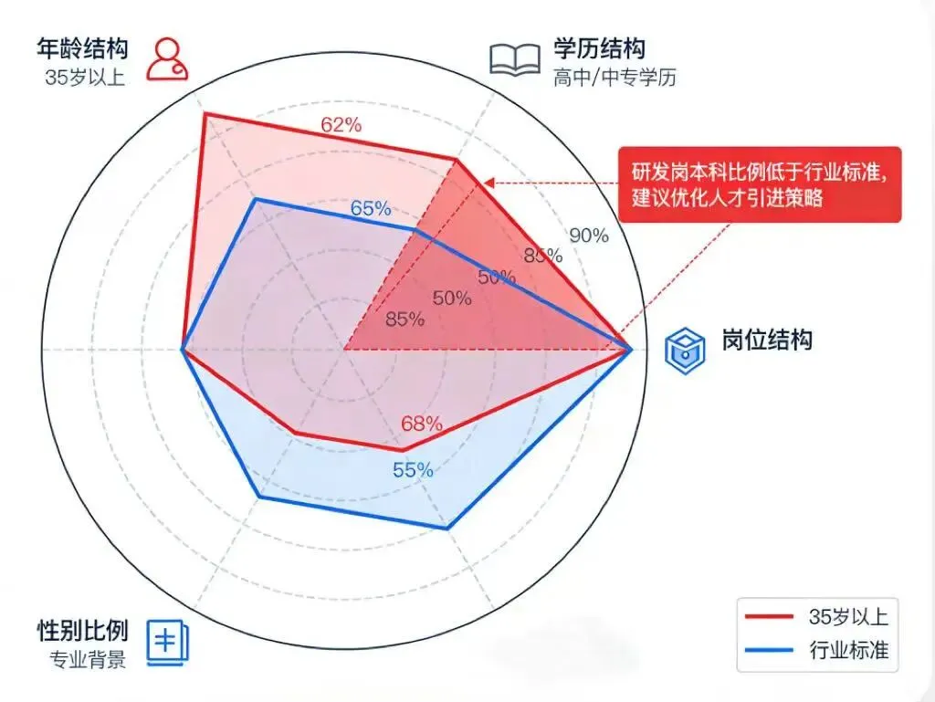 怎么分析:用雷达图展示人才结构,和行业标准比一比。如果行业研发岗本科比例普遍超90%,而你们只有75%,那就得考虑调整。