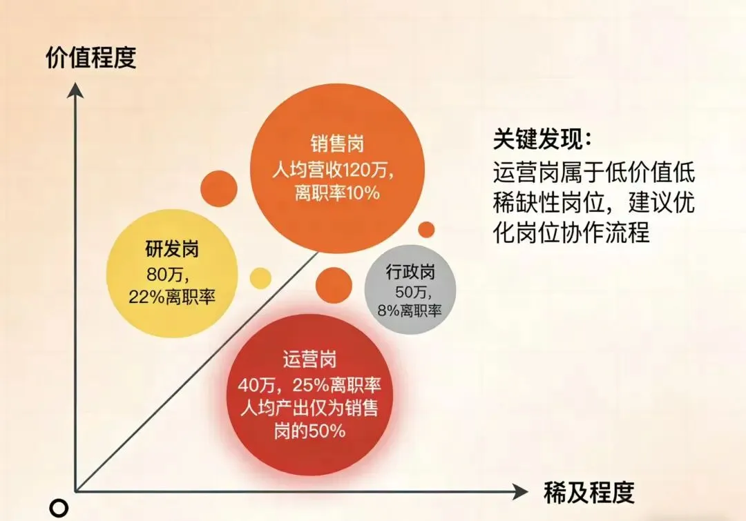 怎么分析:做个人效仪表盘,用波士顿矩阵(岗位价值/稀缺性)找出低效环节。价值低、成本高的岗位,可能是要调整的。