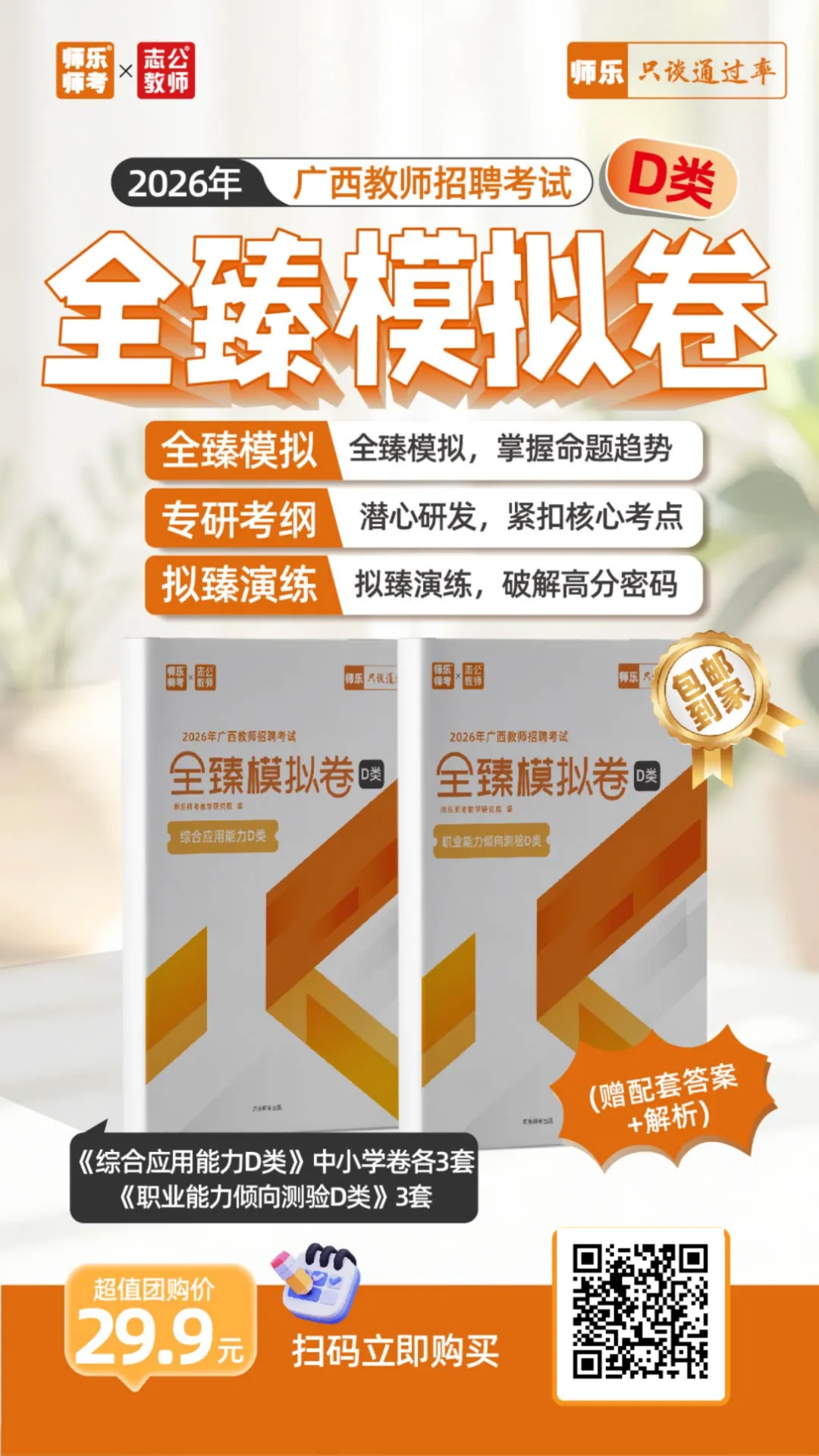 29.9元 = 9套精准模拟卷 + 考点拆解 + 答题技巧 + 考场演练 一杯奶茶的钱,就能拥有一套“备考神器”,帮你节省找题、整理考点的时间,专心冲刺上岸,简直是广西D类考生的福音!