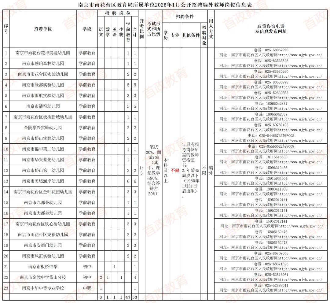 本次招聘相关信息在南京市雨花台区人民政府网(http://www.njyh.gov.cn/)公开发布,各招聘单位网站同步发布。具体的招聘单位、招聘岗位及招聘条件等详见《南京市雨花台区教育局所属单位2026年1月公开招聘编外教师岗位信息表》(附件1,以下简称《岗位信息表》)。