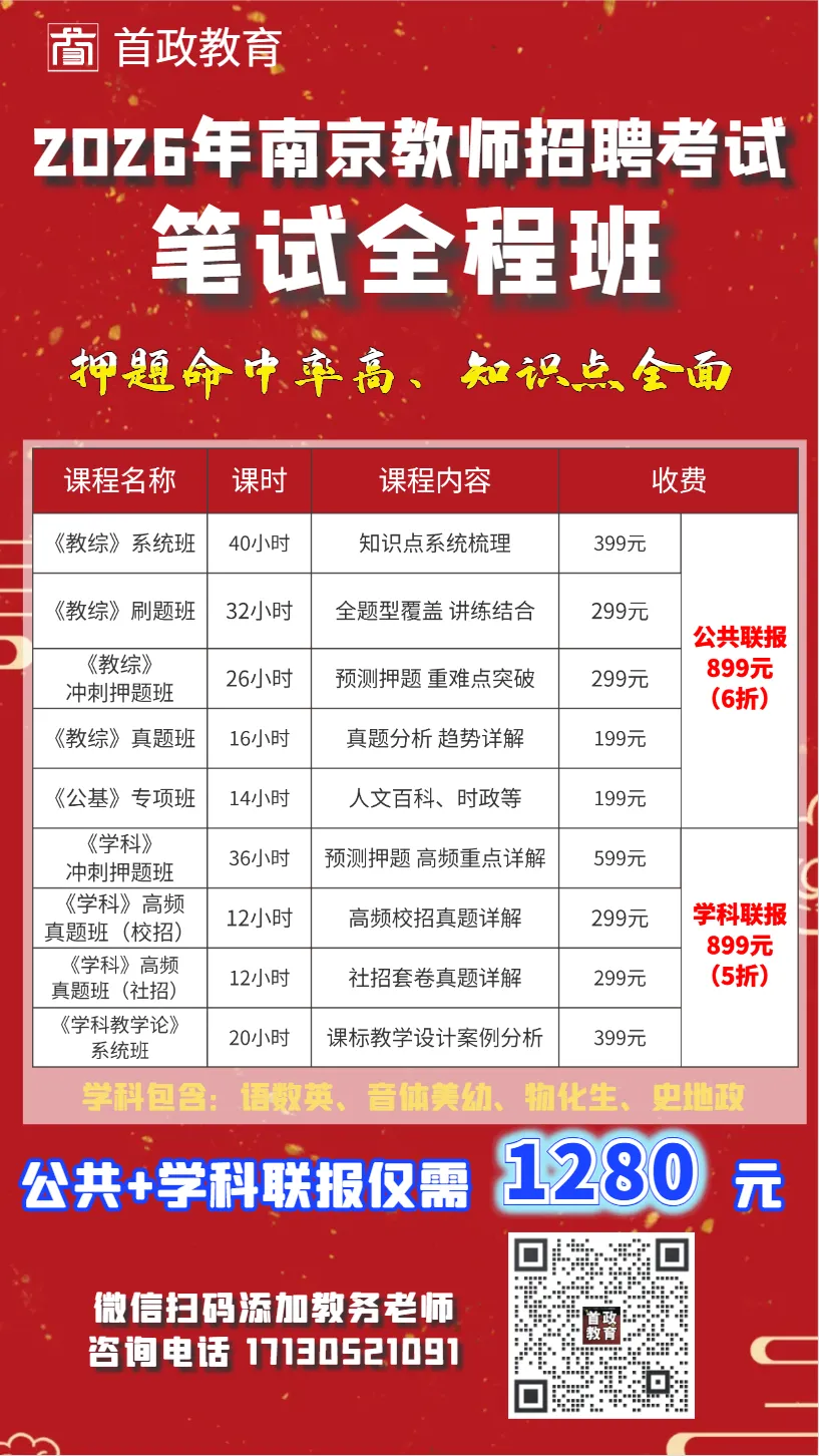 1.具有中华人民共和国国籍,遵守中华人民共和国宪法和法律,拥护中国共产党的领导和社会主义制度;2.具有良好的品行和职业道德,具备正常履行岗位职责所需的身体条件,热爱教育事业,具备教师的基本素质和教育教学能力;5.年龄45周岁以下(1980年1月31日后出生)。2.尚未解除纪律处分或者正在接受纪律审查的人员、刑事处罚期限未满或者涉嫌违法犯罪正在接受调查的人员。3.与招聘单位负责人员有夫妻关系、直系血亲关系、三代以内旁系血亲关系、近姻亲关系及其他须回避的亲属关系的,不得应聘具有直接上下级领导关系的管理岗位。4.根据2020年3月13日颁布施行的《江苏省事业单位公开招聘人员办法》招聘,被聘用到江苏省地方各类事业单位,且在2026年8月5日前未满3年服务期的在编(在册)人员。5.国家和省另有规定不得应聘到事业单位或有关岗位的人员。(1)本次招聘实行网上报名(须用Windows系统的台式电脑或笔记本电脑)。报名、材料及照片上传、资格初审和缴费确认,通过网络同步进行。(2)报名方式:登录(http://zp.yhjyxx.cn:8030/)进行网上报名。(3)报名、材料及照片上传时间:2026年1月31日8:00至2月5日12:00(为避免网络拥堵,请尽早报名)。南京市雨花台区教育局根据设置的招聘条件,负责对网上报名的应聘人员进行报考资格初审。资格初审时间:2026年1月31日9:00至2月5日15:00。3.应聘人员对资格初审异议的陈述申辩时间:2026年1月31日至2月5日期间的9:00-11:00,14:00-16:00。4.资格初审单位对资格初审异议的处理时间:2026年1月31日至2月5日期间的9:00-12:00,14:00-17:00。应聘人员网上提交报名信息后须及时到报名平台查询是否通过资格初审。如对初审意见有异议,请及时拨打招聘咨询电话陈述申辩。在报名结束前,资格初审未通过者,可改报符合资格条件的其他岗位(初审一旦通过,不得改报)。资格初审通过的应聘人员,须于2026年2月5日20:00前在报名平台通过微信支付的方式缴纳报名考试费人民币90元(苏价费函〔2003〕91号)。通过初审并且完成缴费确认的人员,即报名成功。未按规定时间在网上确认报名资格、上传材料及照片、缴纳报名费的视为报名无效,逾期不再提供报名服务。同一岗位符合条件的报考人数原则上应在招聘人数的3倍以上,报名人数未达开考比例将相应核减或取消招聘计划,并在南京市雨花台区人民政府网、各招聘单位网站公布。报名结束后,报考被取消岗位且成功缴费的应聘人员,可2026年2月6日14:00至15:00登录报名平台补报符合条件的其他岗位。通过资格初审且网上缴费成功者请于2026年2月7日9:00起登录报名平台,自行下载打印准考证。网上报名技术咨询及准考证打印问题,请电话咨询:025-89616186(8:30-11:30,14:00-17:00)。(1)应聘人员须如实填报个人信息,提交的报考申请材料应当真实、准确、清晰,报名表中所填专业应与毕业生就业推荐表、教育部学籍在线验证报告(毕业证、学位证、学历学位认证书)一致。凡弄虚作假者,一经查实,一律取消考试或录用资格。(2)照片上传要求为本人近期免冠2寸正面证件电子照片(jpg格式,320×240像素,大小在50KB以下)。②本科及以上学历证书、高等教育学历认证报告(省级及以上教育主管部门出具)或学历证书电子注册备案表(中国高等教育学生信息网下载)、国(境)外留学人员需提供由教育部留学服务中心出具的学历(学位)认证书;所有上传材料均需提供原件的彩色扫描件,JPG或JPEG格式。(1)笔试组织。由南京市雨花台区教育局统一组织,通过资格初审并成功缴费的应聘人员参加笔试。应聘人员应携带准考证和身份证按照规定的时间到考点参加笔试。(2)笔试科目与内容。笔试内容:公共知识,总分为100分,合格线为60分。首政教育提醒您:江苏各市历年真题,扫码后在首政教育微店商城购买,所有资料均为纸质(含答案和解析)(3)笔试时间和地点。笔试时间为2月8日上午,具体时间、地点和要求以准考证标注的为准。(4)成绩查询及打印。应聘人员可于笔试后次工作日凭本人报名时使用的账号和密码,登录报名平台查询笔试成绩并打印。笔试成绩一年内有效。本次公开招聘考试没有复习大纲、复习资料,也不委托任何机构举办培训班、补习班。社会上任何声称针对本次考试的培训活动、培训资料与本次招聘的组织部门和招聘单位无关。面试前,招聘单位将在笔试合格者中,按高分到低分顺序,按实际岗位招聘数的相应比例(同开考比例)确定进入资格复审人员并在各招聘单位网站公布。资格复审不合格的,取消面试资格,并从高分到低分依次递补面试人选。应聘人员请在笔试成绩公布后,保持手机畅通,以便招聘单位通知资格复审或递补,无法联系者视为自动放弃。资格复审须应聘人员本人到场,并携带网上报名时上传的所有报名材料原件(校验)、复印件(留存)。资格复审所提交的材料如有弄虚作假的,将取消应聘人员的面试和录用资格。资格审查工作贯穿公开招聘全过程。资格复审合格者进入面试。进入面试人员名单将于资格复审后在各招聘单位网站公布。面试由各招聘单位根据公开招聘有关规定组织实施。面试当天考生须携带本人有效身份证原件,采用现场抽签的方式确定面试顺序。面试采用课堂教学和综合答辩相结合的形式,面试总成绩为100分,合格线为60分。其中课堂教学80分,综合答辩20分,合格线均为该项测试成绩的60%。面试成绩
