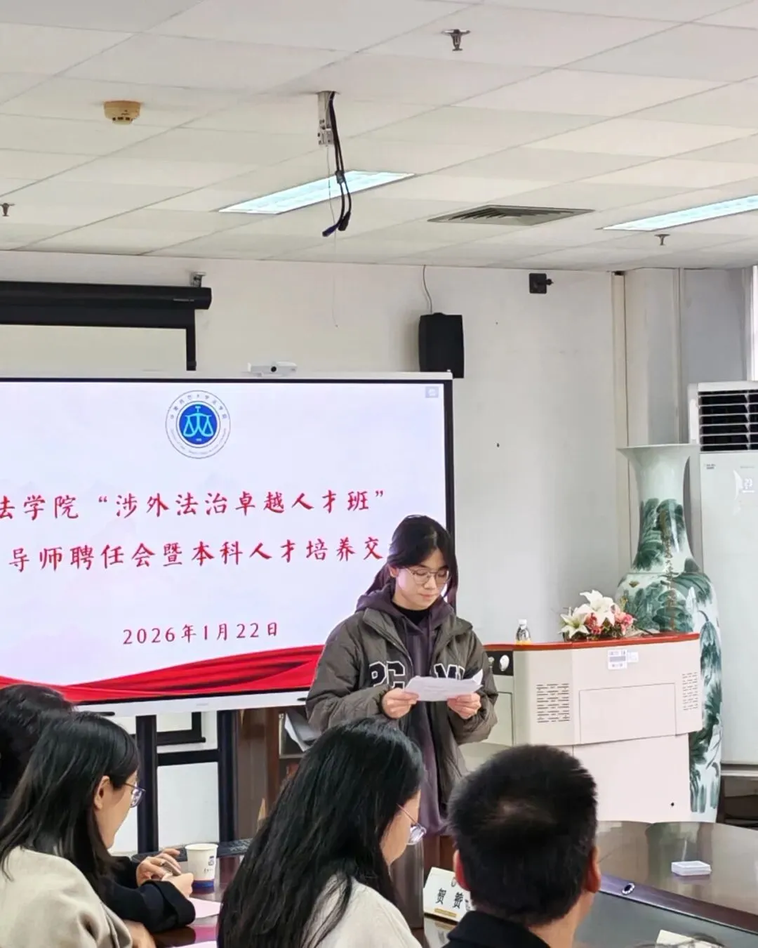 2025级“涉外法治卓越人才班”的刘子铭同学代表全班发言,向莅临现场的各位导师致以最诚挚的欢迎与衷心的感谢。她表示,同学们对涉外法治领域满怀期待,并郑重承诺,将以饱满的热情和务实的态度投入学习,努力把导师们的实践经验内化为自身能力,不辜负导师们的期望,勇担时代赋予的使命。