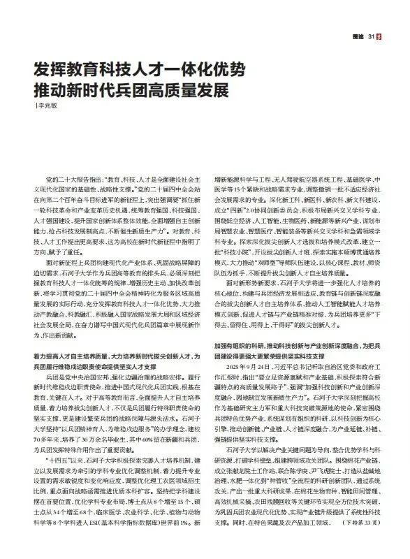 面对新征程上兵团构建现代化产业体系、巩固战略屏障的迫切需求,石河子大学作为兵团高等教育的排头兵,必须深刻把握教育科技人才一体化统筹的规律,增强历史主动、加快改革创新,将学习贯彻党的二十届四中全会精神转化为服务区域高质量发展的实际行动,充分发挥教育科技人才一体化优势,大力推动产教融合、科教融汇,积极融入国家战略发展大局和区域经济社会发展全局,在奋力谱写中国式现代化兵团篇章中展现新作为、作出新贡献。