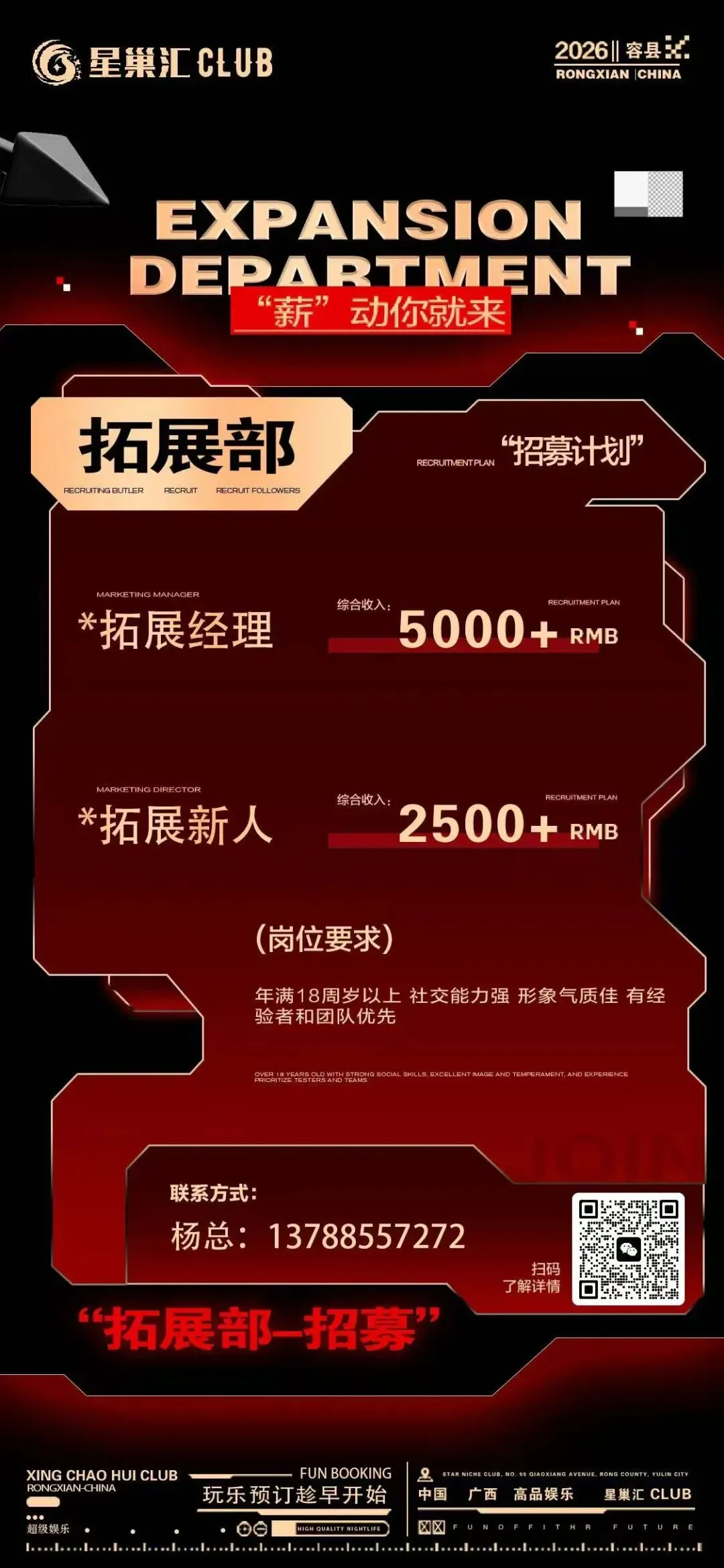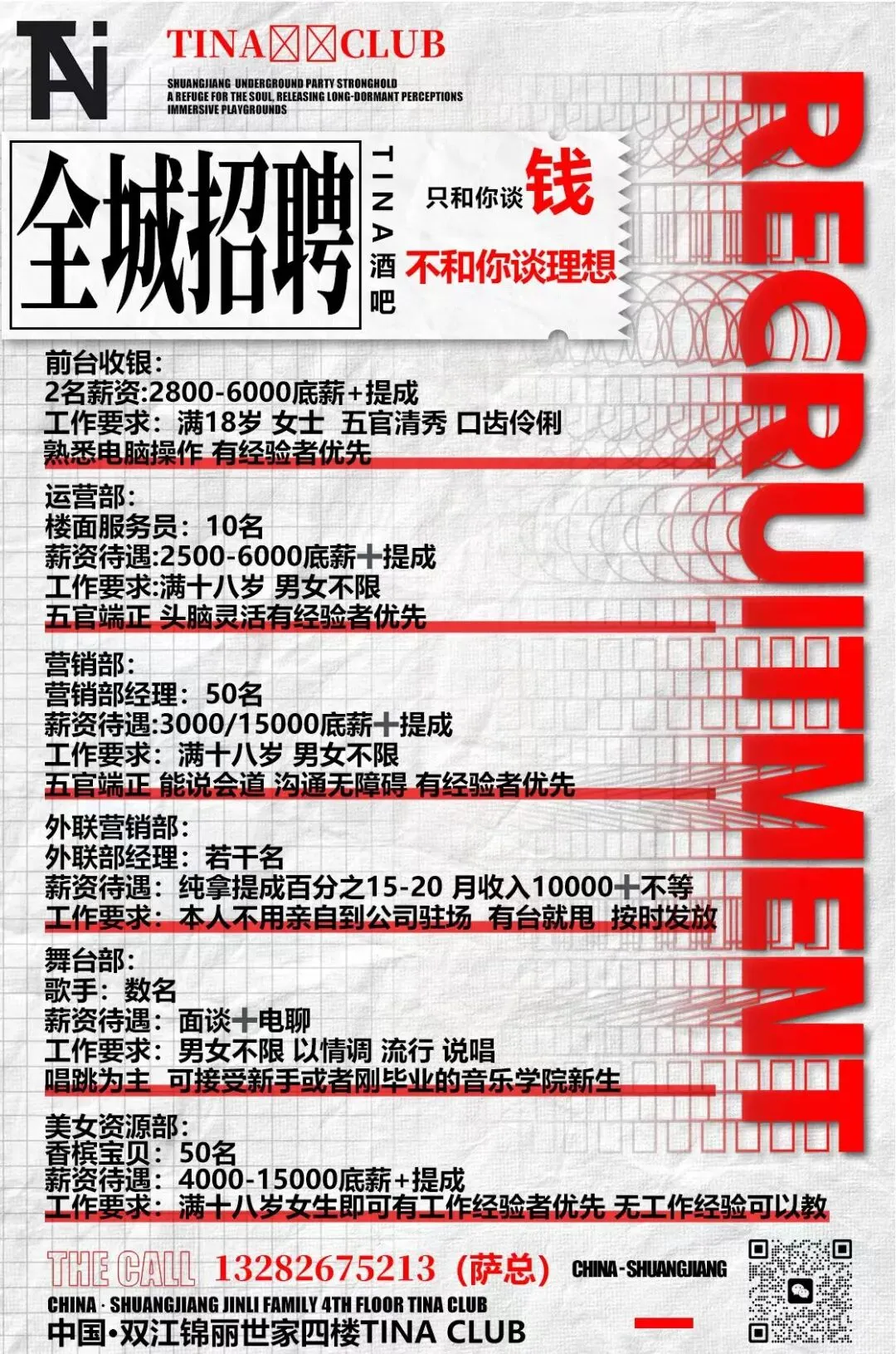 急急急优质女MC一名,价位自曝,要求:服装形象业务,简单网红颗粒舞蹈、爆点 纯女M或者女歌手转MC都可以,净身高166起上,带薪月休2天 小费满天飞 档期稳定工资准时 团队和谐 VX:Davids189