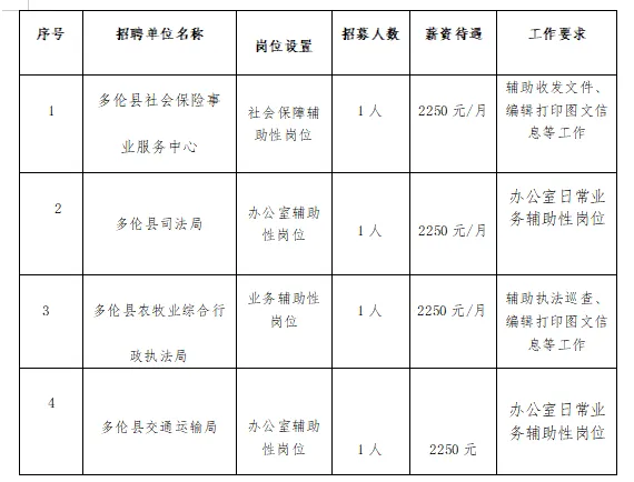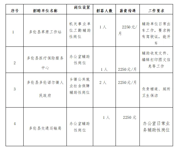 多伦县自2024年以来共开发公益性岗位160个。现招募2026年第一批公益性岗位工作人员9名,其中就业困难高校毕业生4名、失业人员再就业5名。公开招聘人数及岗位设置: