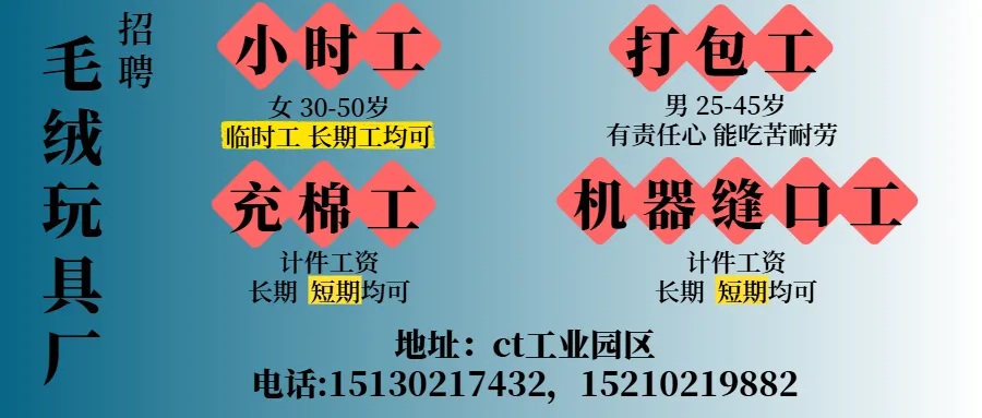毛绒玩具招聘 日结工 长期工