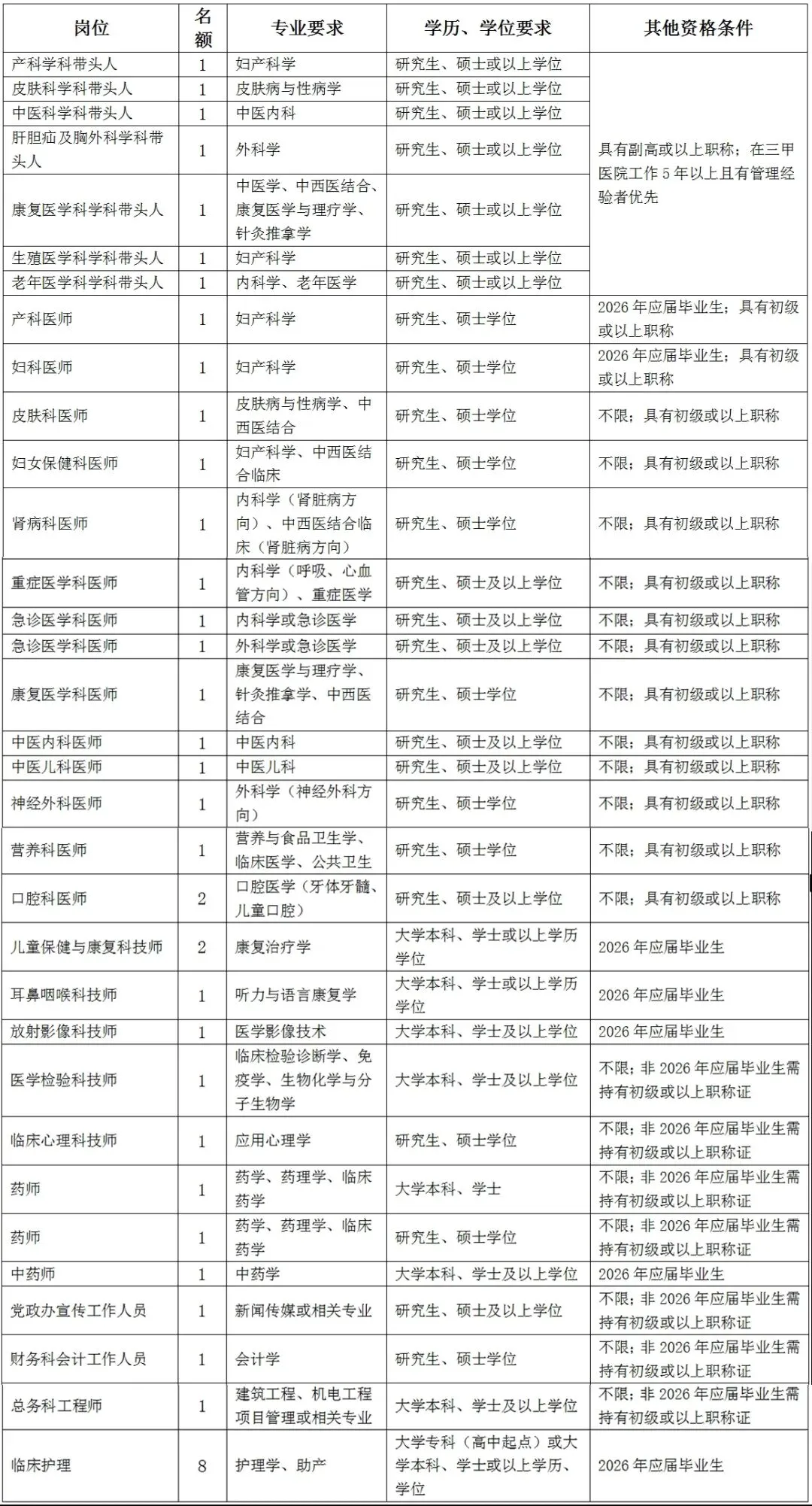1.应聘人员的学历、学位和专业技术资格,须国家承认。应聘人员须在报名前取得符合岗位要求的毕业证书、学位证书、专业技术资格证、执业资格证书、执业注册证等相关证书(其中,2026年毕业生须在2026年12月31日前取得毕业证书和学位证书,2026年度完成住院医师规范化培训的人员须在2026年12月31日前取得住院医师规范化培训合格证,否则取消拟聘用资格);
