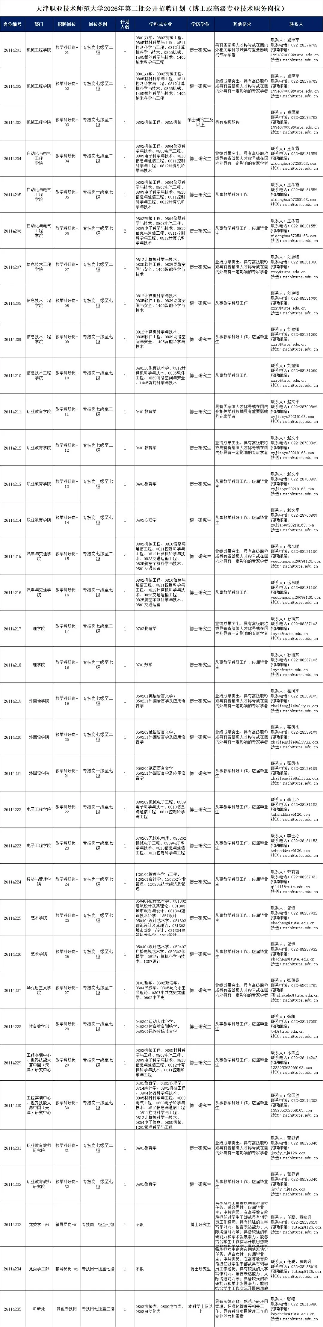 方案发布7个工作日后开始接受报名,即2026年2月9日,报名时间不少于5个工作日,岗位报名截止情况将在天津职业技术师范大学网站(https://www.tute.edu.cn/)公开招聘专栏发布。应聘人员请将下述材料通过电子邮件形式发送至招聘部门邮箱(见附件),并抄送至学校人事处邮箱(见附件):