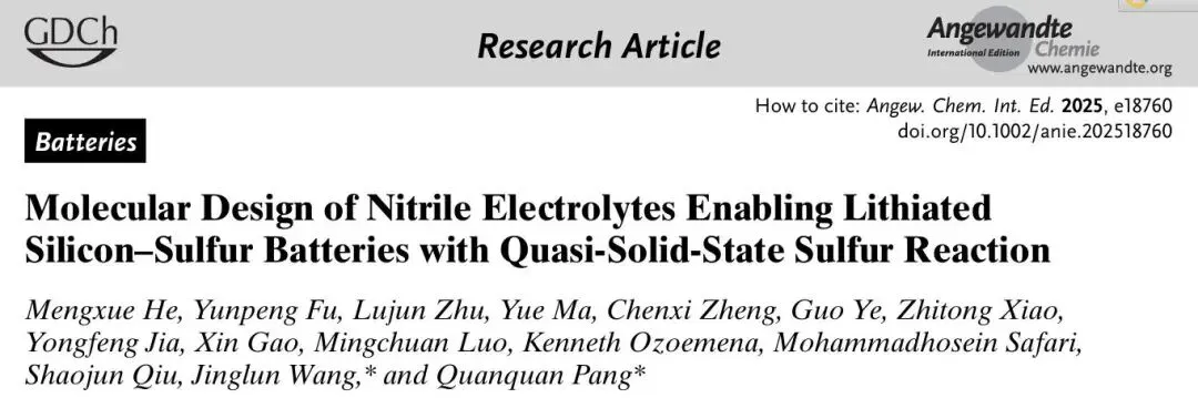 Molecular Design of Nitrile Electrolytes Enabling Lithiated Silicon–Sulfur Batteries with Quasi-Solid-State Sulfur Reaction, Angewandte Chemie International Edition 2025 DOI: 10.1002/anie.202518760