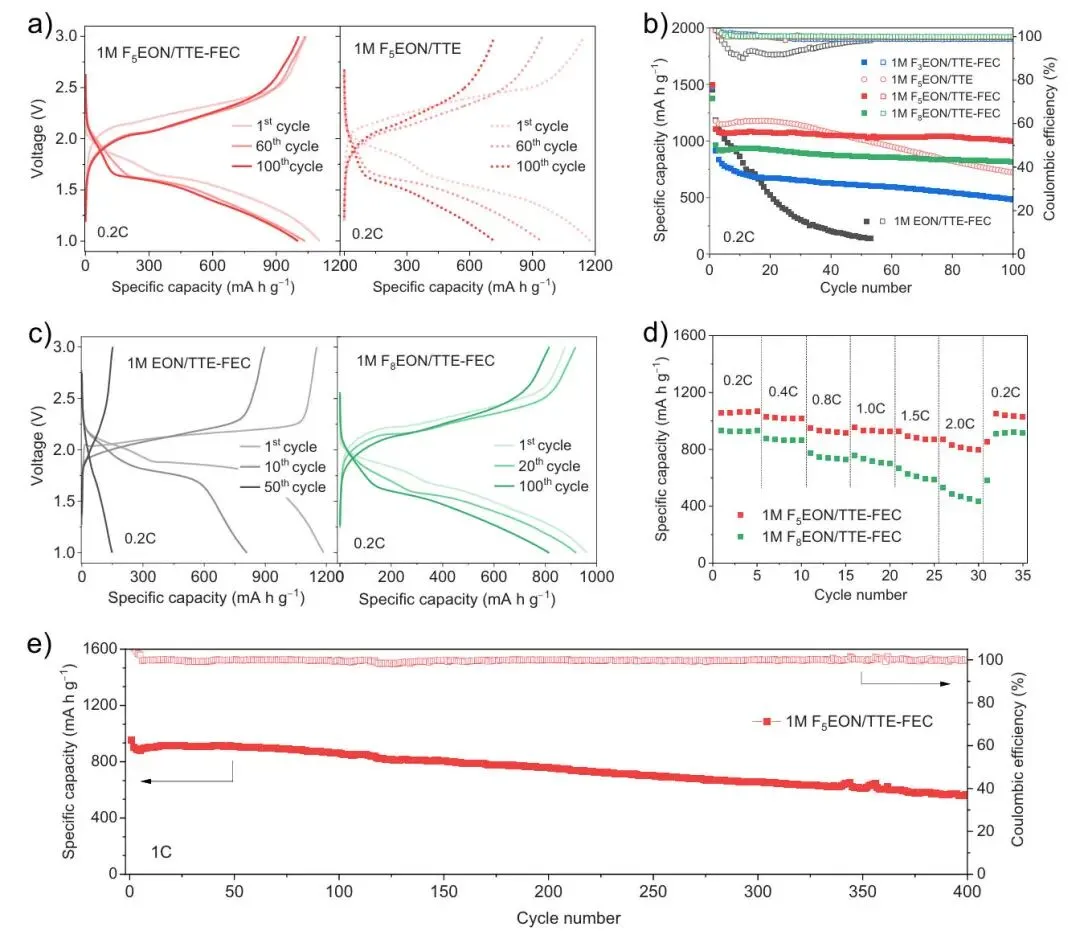 氟代碳酸乙烯酯通过亲核反应与多硫化物形成正极电解质界面(CEI),并将其包封,同时稳定了锂化硅负极的固体电解质界面(SEI),从而减轻了穿梭效应和硅负极的体积膨胀。优化后的F₅EON/TTE-FEC电解质提供了稳定的电化学性能,在0.2C下循环100次后保持了90.2%的初始容量,平均库仑效率高达99.9%。这些发现为高能量锂化硅-硫电池的实际应用提供了重要的电解质设计思路。