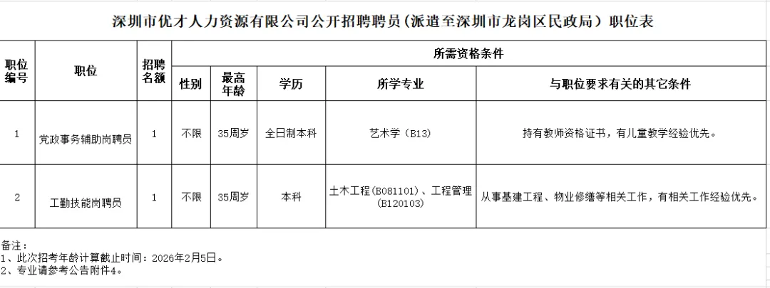 1.深圳市优才人力资源有限公司公开招聘聘员(派遣至深圳市龙岗区民政局)职位表