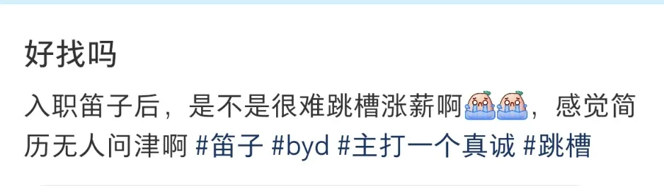 最近看到这个帖子,一个211本科、在比亚迪干了一年半的员工,已经开始明显焦虑了:简历投出去没人问,感觉自己被“温水煮青蛙”,越待越没身价。评论区吵得很真实,有人说“挺好跳的”,也有人直言“HR看到在迪子干的活就开始难绷”。