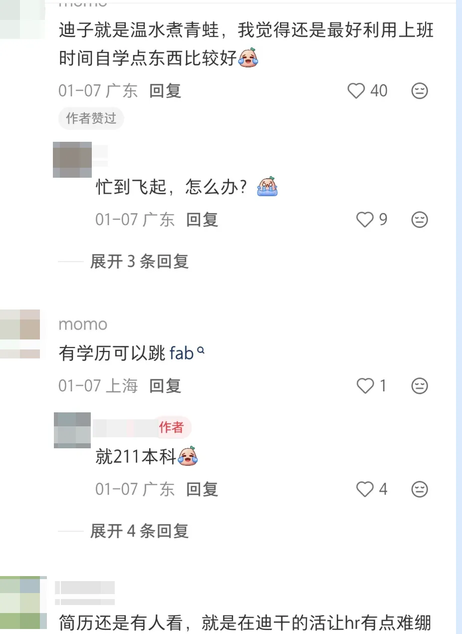 帖子里有句话我反而觉得特别清醒:“迪子就是温水煮青蛙,最好利用上班时间自学点东西。”