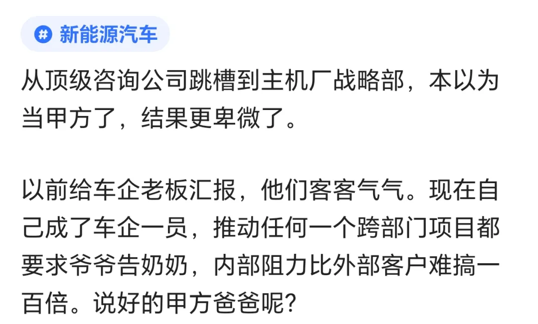 >新能源汽车员工爆料:从顶级咨询公司跳槽到主机厂战略部,本以为当甲方了,结果更卑微了.推动任何一个跨部门项目都要求爷爷告奶奶!