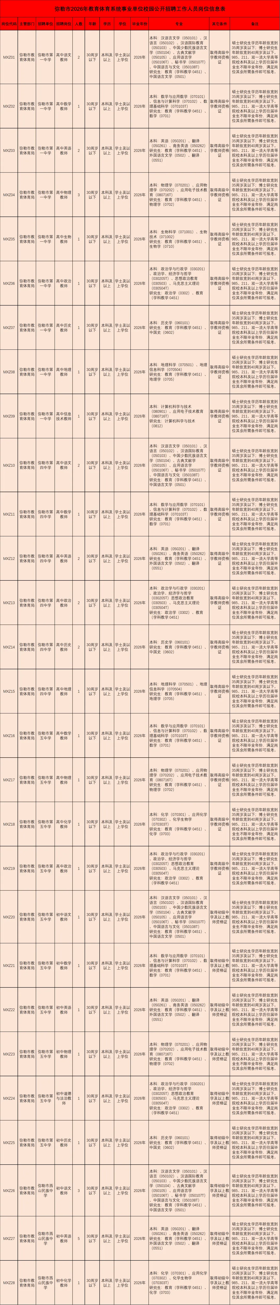 具体招聘岗位详见《弥勒市2026年教育体育系统事业单位校园公开招聘工作人员岗位信息表》(附件1)。