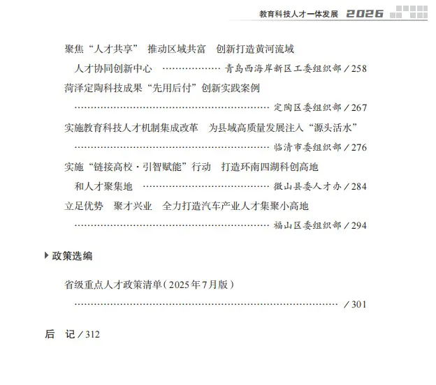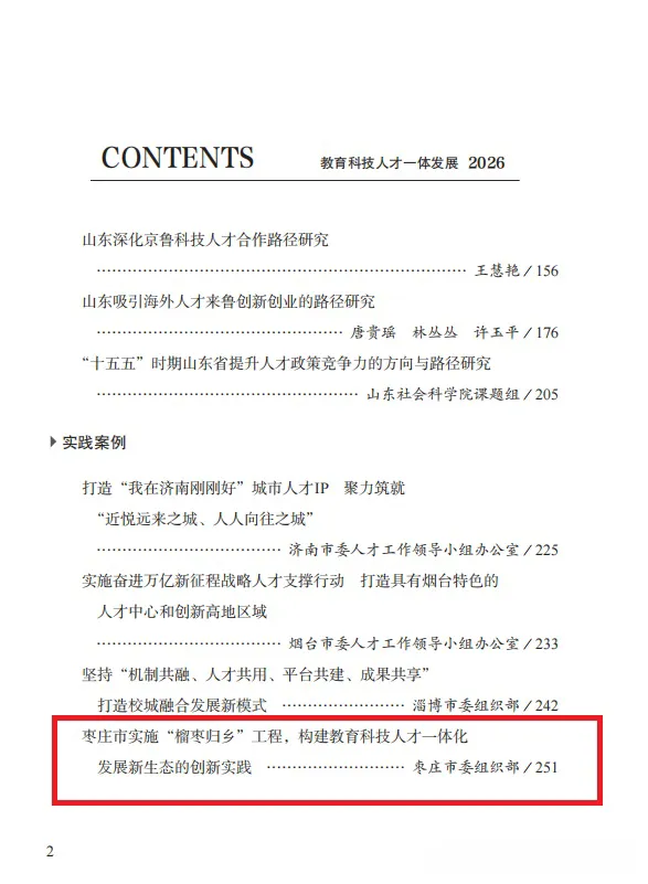 2026年山东系列蓝皮书近日正式发布,其中由山东人民出版社出版的《山东人才发展蓝皮书(2026)》收录了枣庄市人才工作创新实践案例——《枣庄市实施“榴枣归乡”工程,构建教育科技人才一体化发展新生态的创新实践》,并向全省推介。山东人才发展蓝皮书系统总结了山东在推进教育科技人才一体发展方面的实践探索、显著成效与未来路径,旨在为全省各级党委政府提供决策参考,更希望通过该书进一步凝聚各方共识,共同为山东打造全国重要人才中心和创新高地,构建富有山东特色的人才发展新格局贡献智慧。山东系列蓝皮书是山东社会科学院重点打造的学术品牌,已经成为分析预测山东经济社会发展形势、服务现代化强省建设的重要智库成果平台。