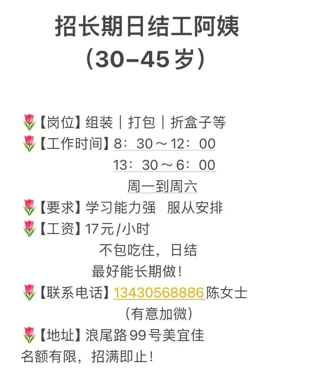 招兼职小时工数名,年龄40岁以下,可以做到年后