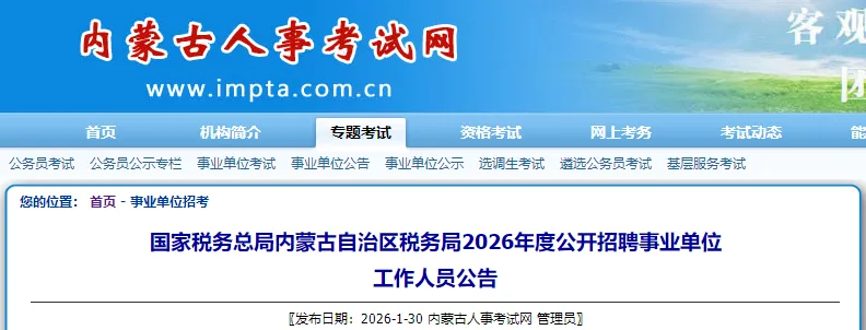 根据《事业单位公开招聘人员暂行规定》《全国税务系统事业单位公开招聘人员办法》等有关规定,经国家税务总局批准,国家税务总局内蒙古自治区税务系统2026年拟面向社会公开招聘工作人员。现将有关事项公告如下: