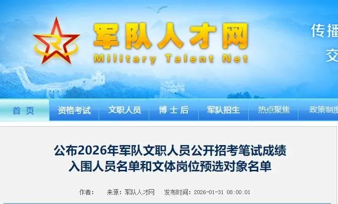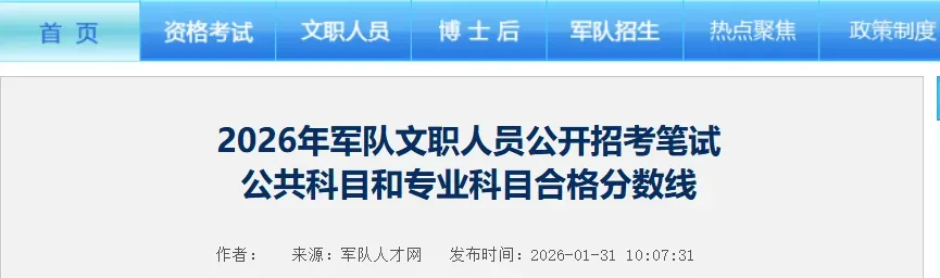军队人才网官网:2026年军队文职笔试成绩公布!最低25分!