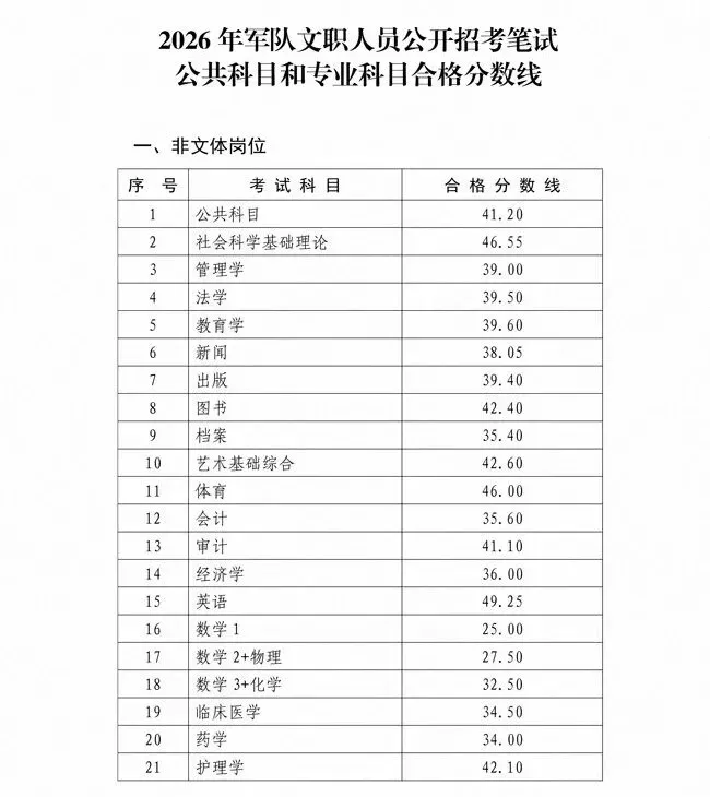 💥2026军队文职公共科目和专业科目合格分数线💥