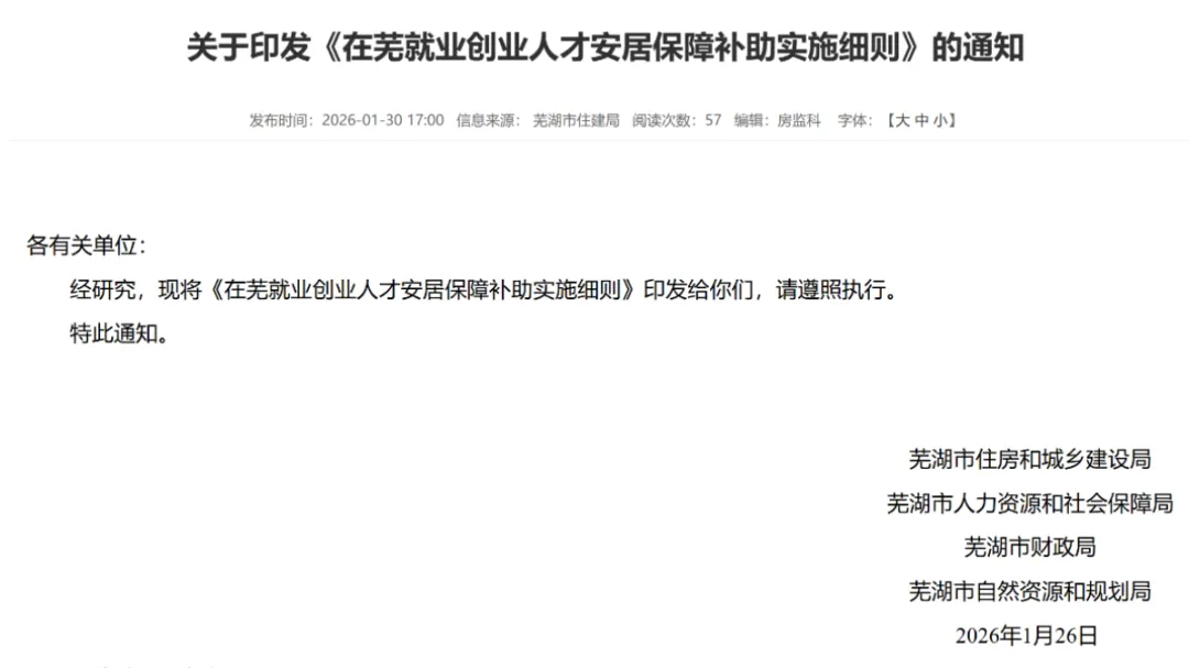 自2026年3月1日起,在芜湖市市区购买首套144㎡以下新建新建商品住房,并符合条件的在芜就业创业人才,可根据申请人相应学历水平,最高给予购房款1%的购房补助和2万元安家补助。