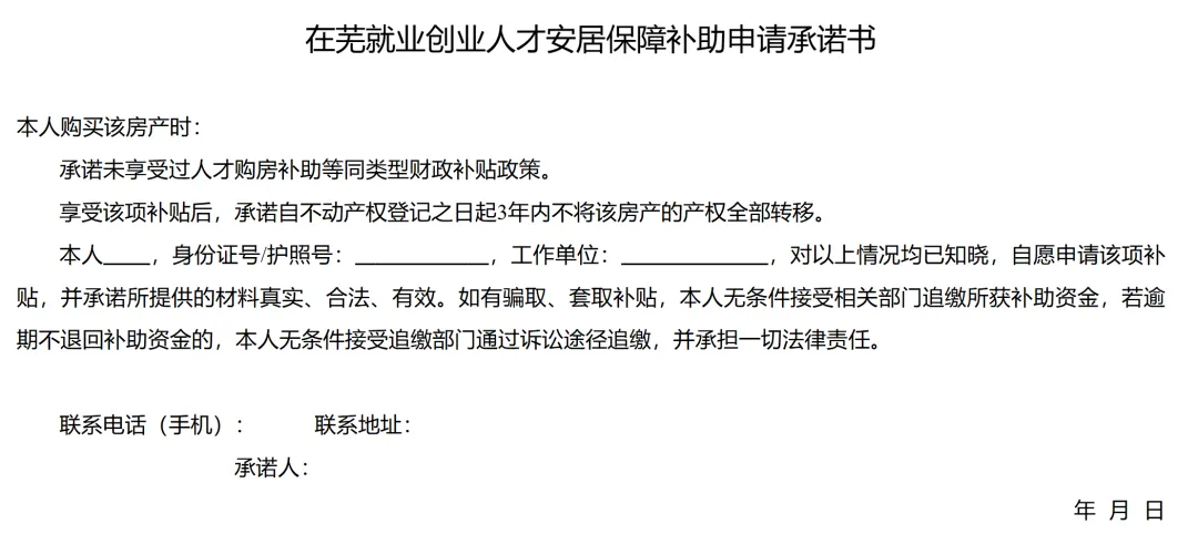 (8)在芜就业创业人才安居保障补助申请承诺书(附件1)。