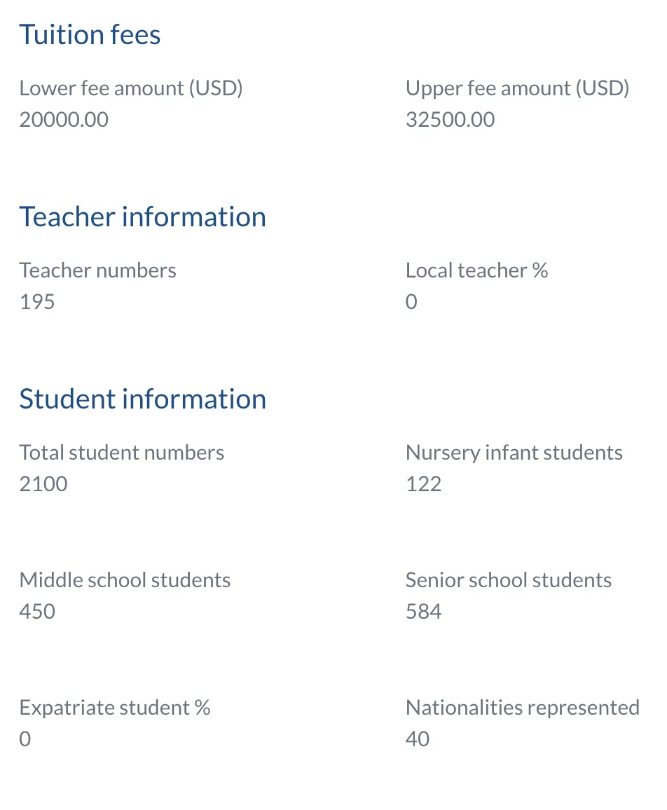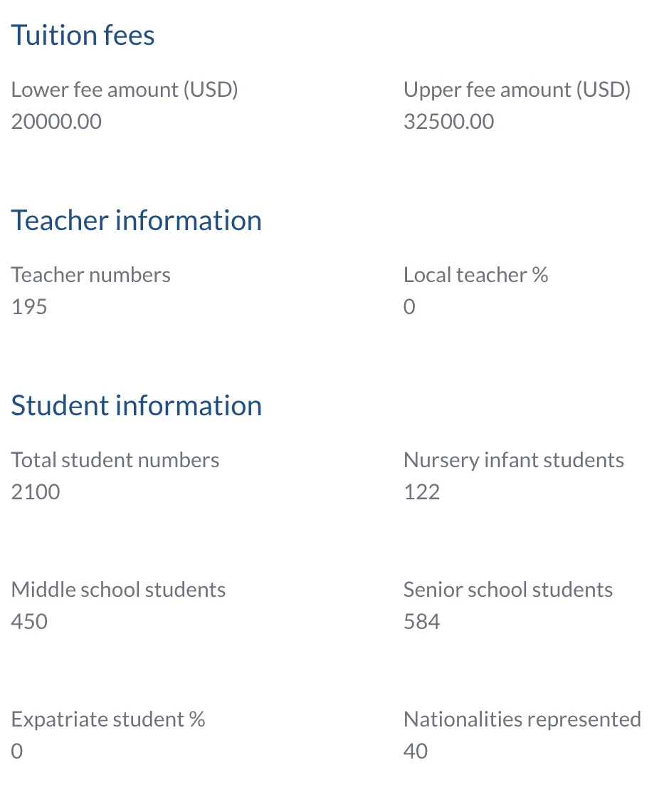 Tuition fee subsidy* for teaching staff children (80% reduction in tuition fees and 100% on capital levy for up to 2 students per teacher/teaching couple from Early Years 2 (Age 4) to Grade 12, provided there are available student spaces as per the school's current staff tuition policy, pending admission acceptance). *Tuition fee subsidy refers to subsidy given for tuition fee, annual capital levy, application and entry fees. No subsidy is given for IB exam fees, 1:1 laptop program, tech fee, experience/CAS week, school trips, bus or food services, or other incidental fees/cost.