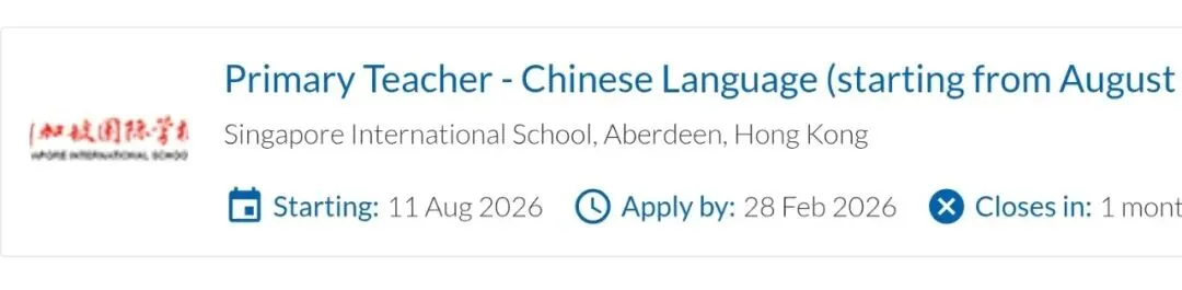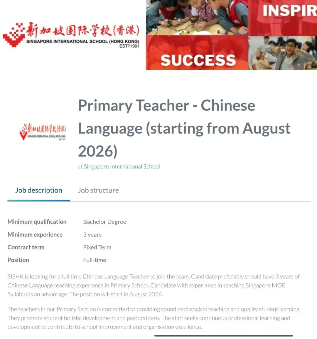 SISHK is looking for a full time Chinese Language Teacher to join the team. Candidate preferably should have 3 years of Chinese Language teaching experience in Primary School. Candidate with experience in teaching Singapore MOE Syllabus is an advantage. The position will start in August 2026.The teachers in our Primary Section is committed to providing sound pedagogical teaching and quality student learning. They promote student holistic development and pastoral care. The staff seeks continuous professional learning and development to contribute to school improvement and organisation excellence.Possess an undergraduate degree and a recognised teacher certification, i.e. Bachelor of Education, Postgraduate Diploma in Education or equivalentHave 3 years’ teaching experience in Primary Chinese LanguageExperience in teaching the Singapore MOE Syllabus is a plusMOE Education Officers from Singapore are welcome to applyInterested parties, please send a cover letter, detailed resume including availability, present and expected salary by email to recruit@singapore.edu.hk. Only shortlisted candidates will be notified.简单说一下这个学校。这个学校相对来说在香港应聘难度不大。但是他对于薪资比较敏感,所以老师在申请的时候需要把自己现在以及自己期待的薪资如实的告知对方,不是每个学校都有这样的操作,很多学校并没有这样的流程。所以这一点是需要注意的,如果开的过高的话,可能连第一轮都进不了,所以要稍作留意。该校有近2000名学生,准确的说是1900多,所以相对来说也是一个大的学校。他们欢迎来自新加坡的应聘者。我们有以下群组,静待您的到来——