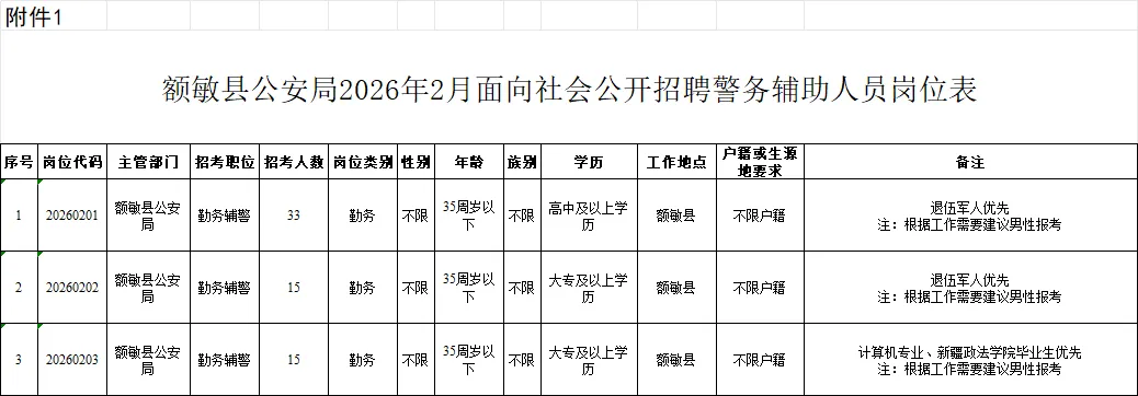 根据岗位性质和工作任务,本次计划面向社会公开招聘辅警63名。具体岗位要求详见《额敏县公安局2026年2月面向社会公开招聘警务辅助人员岗位表》(附件1)。