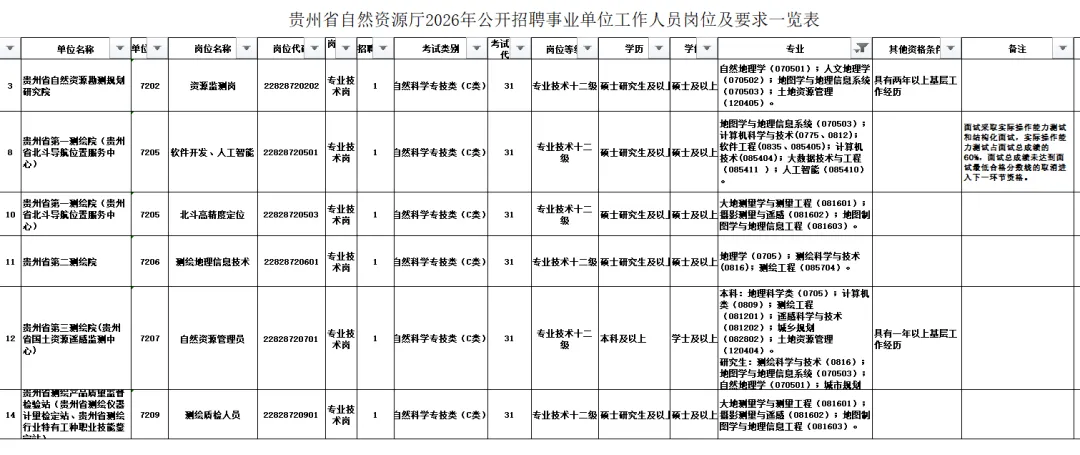 附件1:贵州省自然资源厅2026年公开招聘事业单位工作人员岗位及要求一览表.xls