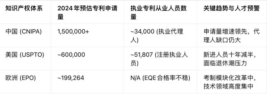 面对人才缺口,全球主要知识产权体系都在调整制度设计,中国也结合本土实践,走出了适配行业发展的改革路线。
