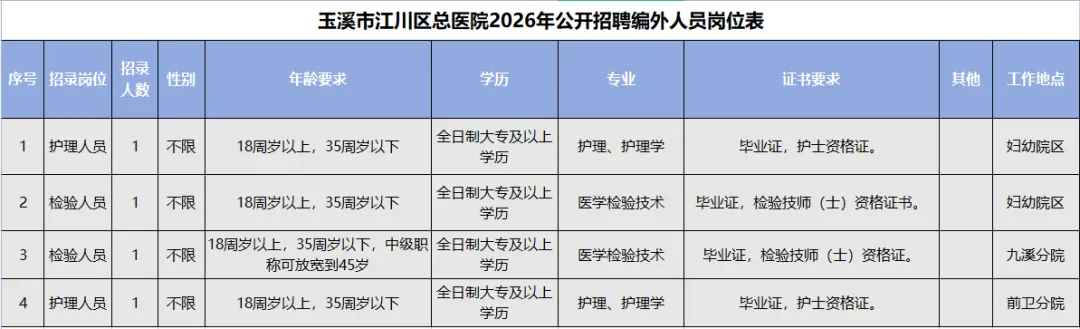 详见《玉溪市江川区总医院2026年公开招聘编外人员岗位表》。