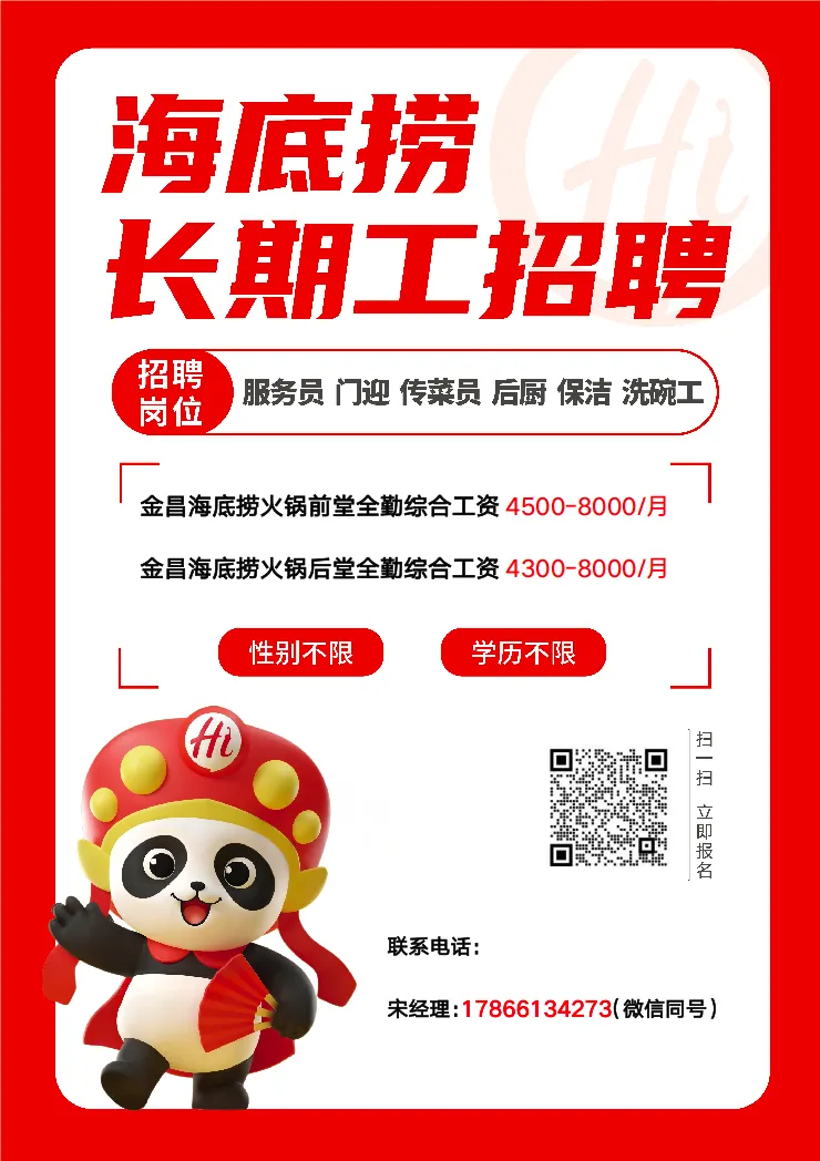 因业务需要金戈市场业之峰装饰公司现招聘岗位若干名:以上岗位要求年龄55岁以下,性别不限,学历不限,有相关工作经验者优先,工资底薪加提成加奖金,福利待遇优厚。金昌国芳广场海底捞火锅新店盛大开业,欢迎金昌父老乡亲前来品常,现因业务需要招聘长期工若干名: