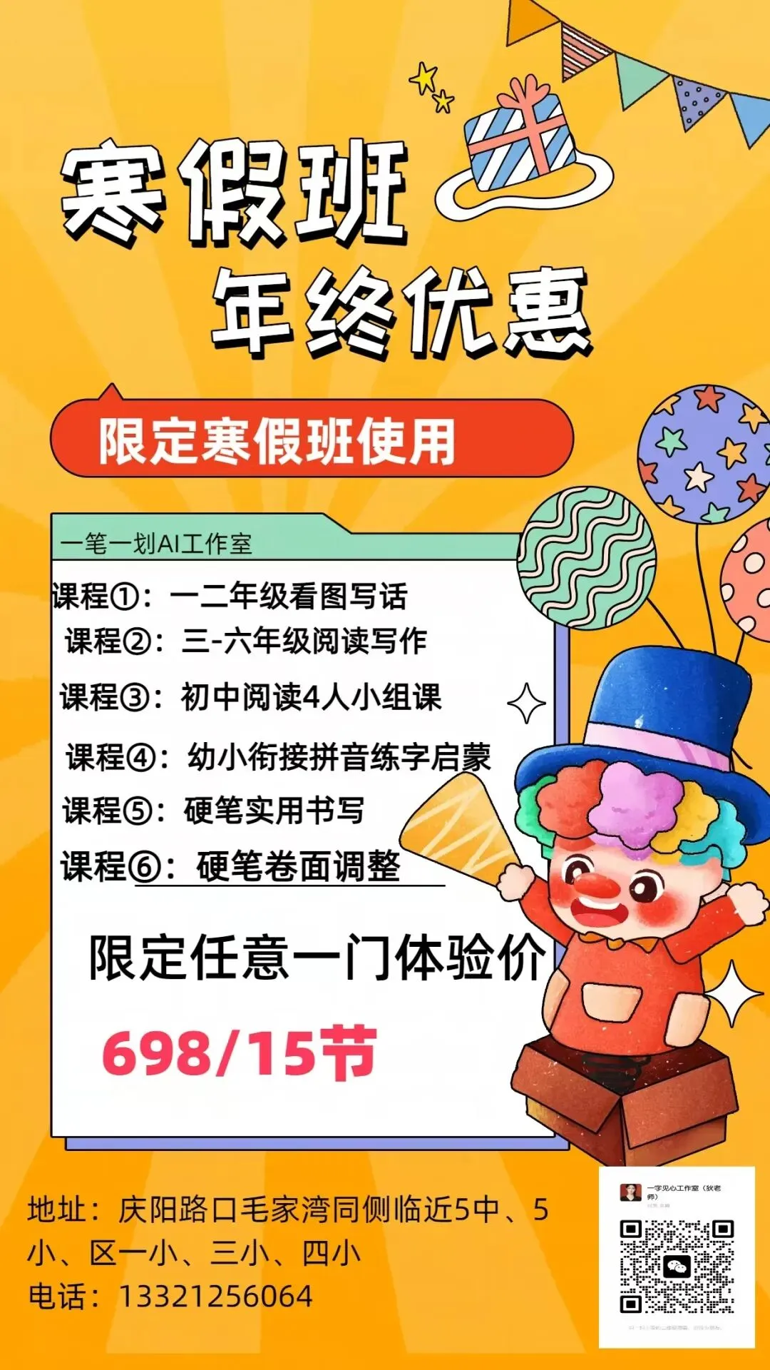 书法工作室寒假班招生开始了,现在报名还有优惠,早八晚六全天安排,年前预报春季班一学期课程送一台价值700元学习机,老带新拼团再打八折优惠,具体情况如下图: