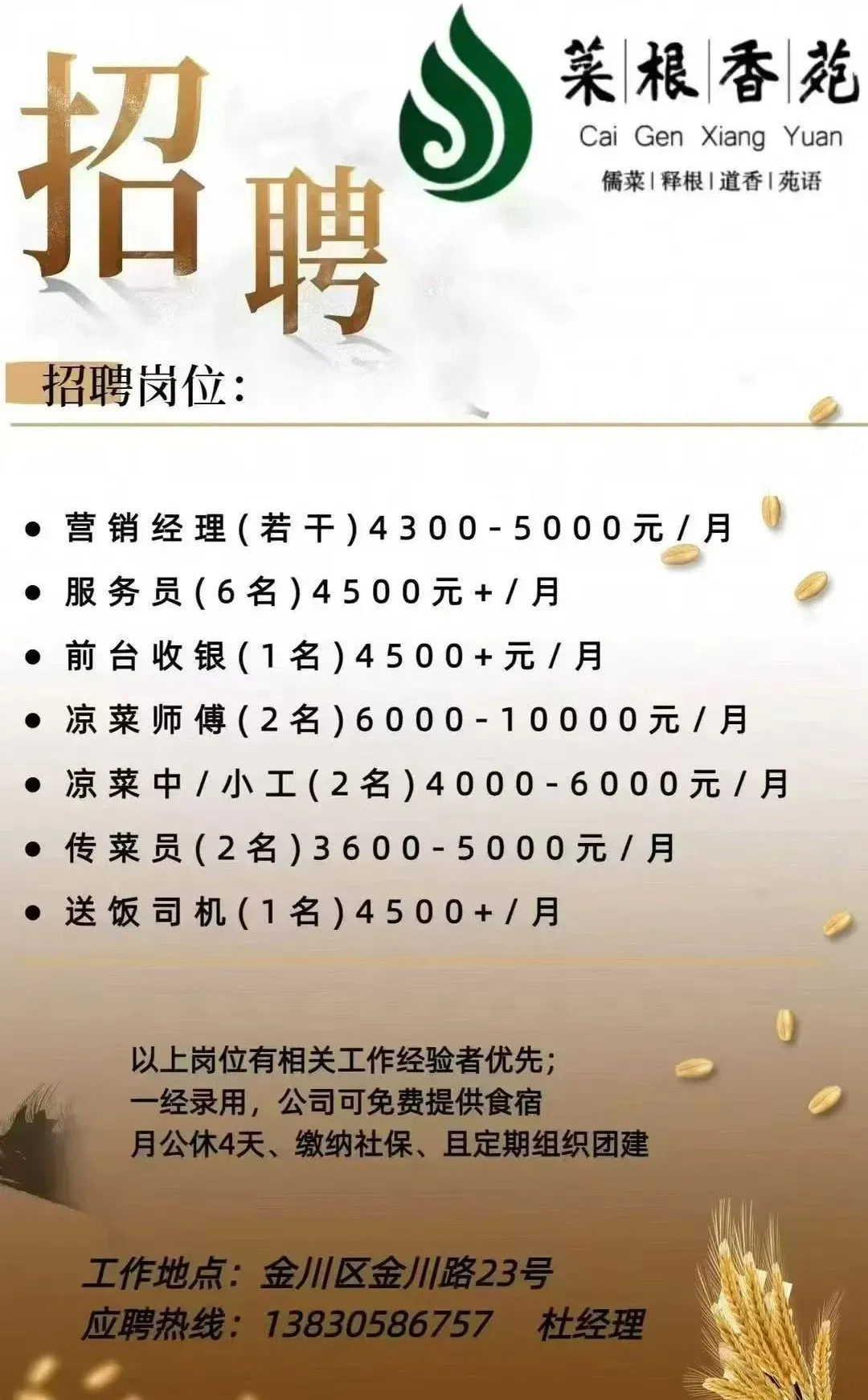 菜根香苑餐饮店招聘