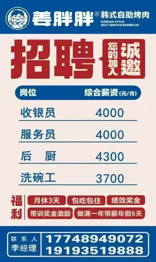 品广场姜胖胖韩式自助烤肉店招聘服务员10名、收银员3名、后厨和洗碗工各2名,要求初中及以上学历,有相关餐饮工作经验优先:联系电话:13689497989或13993427207