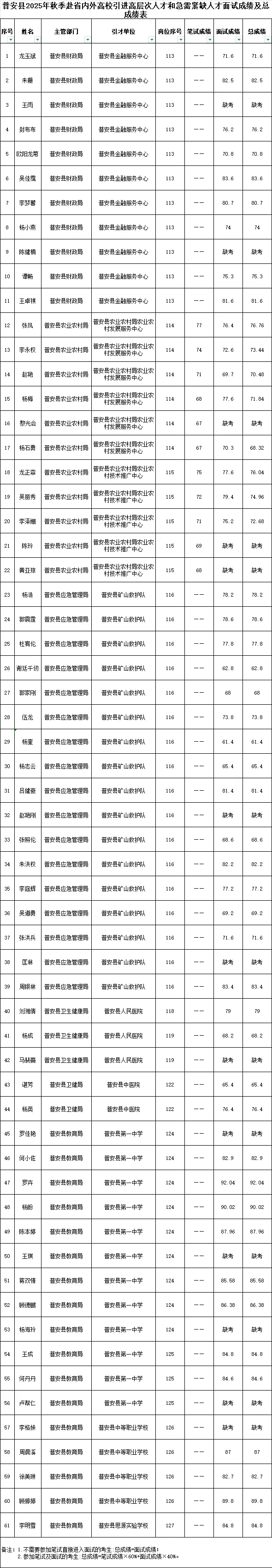 根据《黔西南州2025年秋季赴省内外高校引进高层次人才和急需紧缺人才公告》《普安县2025年秋季赴省内外高校引进高层次人才和急需紧缺人才实施方案》规定,现将面试成绩及总成绩公示如下: