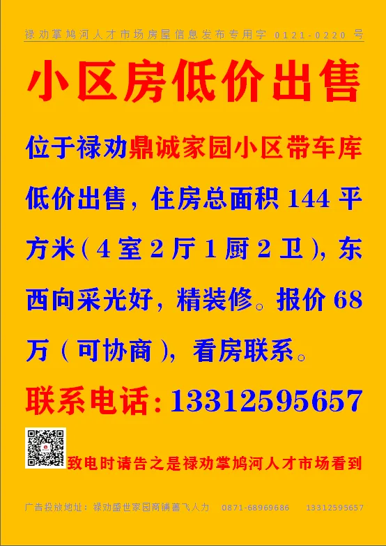 位于禄劝鼎诚家园小区带车库低价出售,住房总面积144平方米(4室2厅1厨2卫),东西向采光好,精装修。报价68万(可协商),看房联系。
