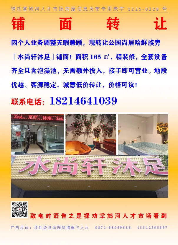 因个人业务调整无暇兼顾,现转让公园尚居哈鲜族旁「水尚轩沐足」铺面!面积165㎡,精装修,全套设备齐全且含泡澡池,无需额外投入,接手即可营业。地段优越、客源稳定,诚意低价转让,价格可议!