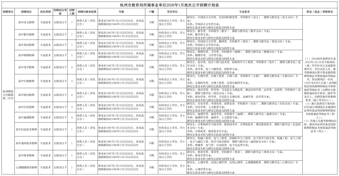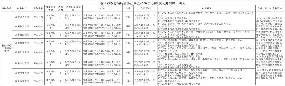 7.具备招聘岗位要求的其他条件,详见《杭州市教育局所属事业单位2026年1月批次公开招聘计划表》。